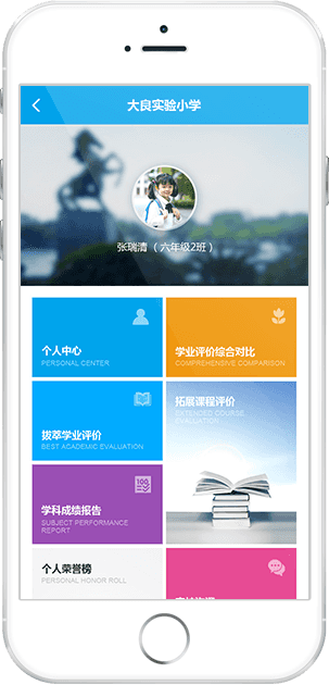 以清新明亮的藍白色色調(diào)為主,再配以草綠、紫紅、橙色、紫色作為業(yè)務板塊色彩,展現(xiàn)出學校活潑可愛、陽光的氣息。主圖以及背景圖則使用學校大門和學校標志性建筑作為圖片展示,帶來熟悉感和親切感。