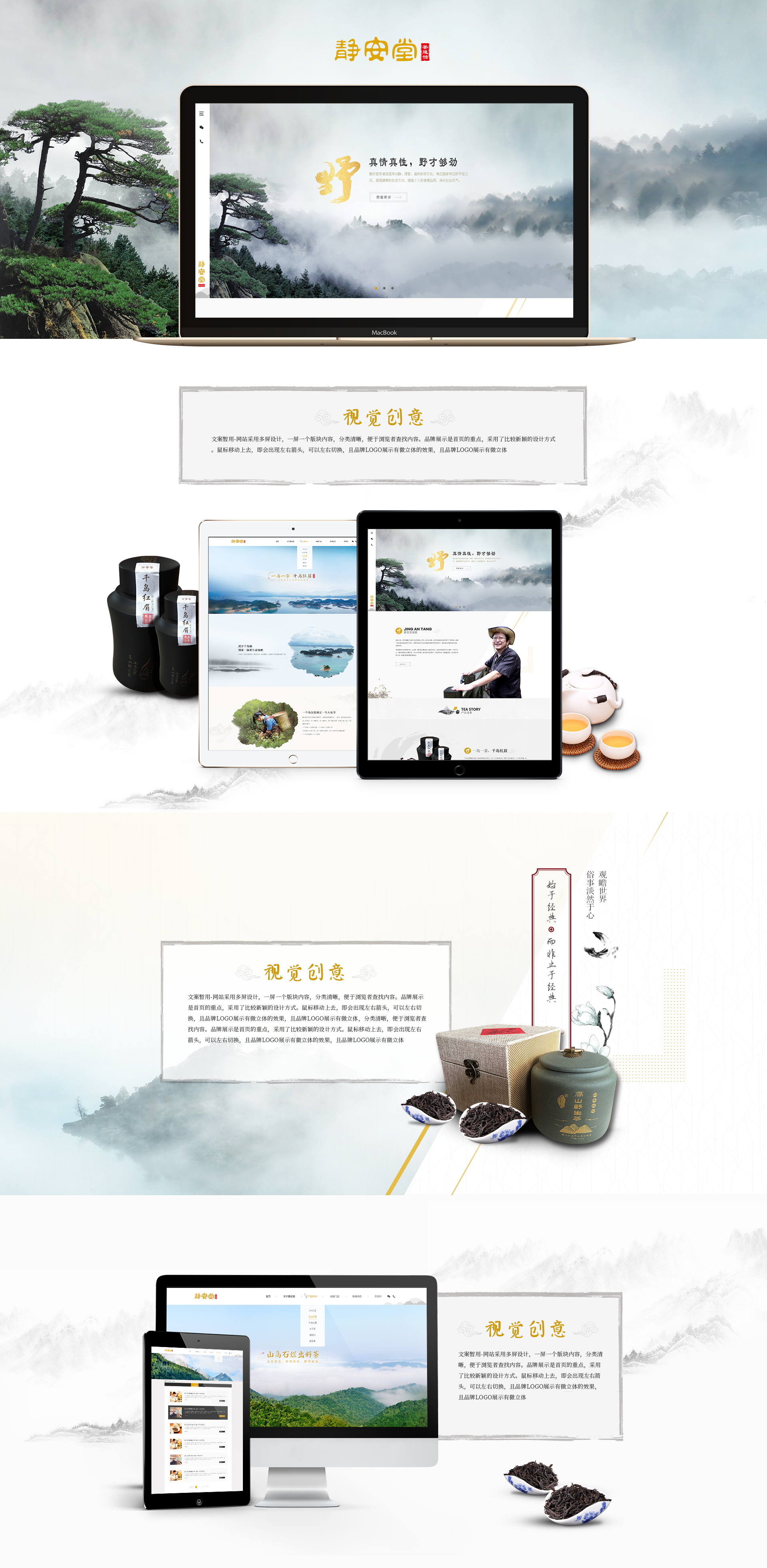 色調(diào)主要以灰白黑為主,通過VI顏色金色點(diǎn)綴,凸顯靜安堂茶葉的禪學(xué)。以中國的祥云水墨展示茶葉文化的古韻古色的特質(zhì)。用“野”的特殊效果展示茶葉的珍貴。整體的架構(gòu)設(shè)計(jì)以簡單、清晰為主線,排版布局合理有序,簡單的操作思路透著抓眼求的視覺沖擊,有效吸引用戶。