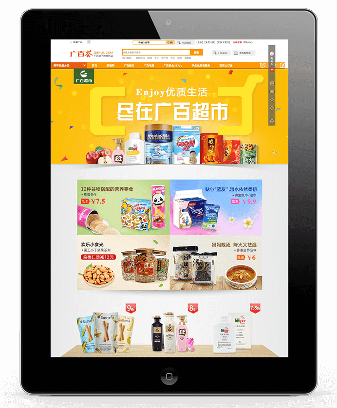 以橙色為主要調(diào)性的視覺設(shè)計(jì)遵循了廣百股份的VI體系,商城給用戶一種活潑、跳動(dòng)的歡快感覺;首頁(yè)廣告色調(diào)繽紛、展示方式活潑,能夠充分調(diào)動(dòng)訪客的購(gòu)物欲望;頁(yè)面的層次清晰,內(nèi)容和展示形式結(jié)合恰當(dāng)。