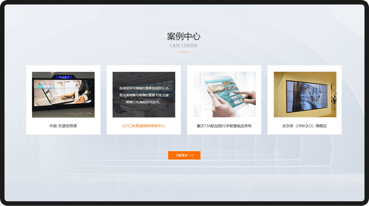 整體版面以單屏滾動形式呈現(xiàn),版面一共分為:banner圖、產(chǎn)品系列、新聞資訊、案例中心,這4大板塊。以新穎的寬屏設(shè)計手法呈現(xiàn),鼠標滑動即可翻到下一頁查看,內(nèi)容主次分明,整體瀏覽舒暢,整體版面內(nèi)容簡約、明了的感覺,頁面調(diào)性統(tǒng)一。