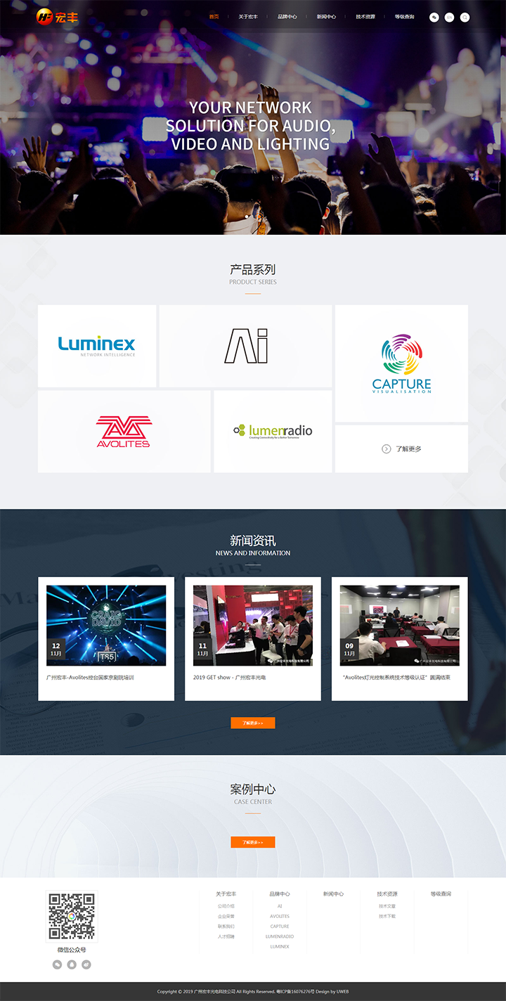 廣州宏豐光電科技有限公司是一家專業(yè)舞臺燈光控制系統(tǒng)、視頻控制系統(tǒng)、視頻顯示系統(tǒng)、音頻系統(tǒng)、技術(shù)服務(wù)為一體系統(tǒng)的集成商,是英國Avolites(愛富麗)旗下燈光控制系統(tǒng)、AI視頻服務(wù)器等全線產(chǎn)品官方授權(quán)中、港、澳地區(qū)的總代理商。憑著優(yōu)異的產(chǎn)品性能、成熟的技術(shù)服務(wù)和深厚的客戶資源,公司在燈光控制、視頻領(lǐng)域迅速崛起。公司聚焦文化創(chuàng)意產(chǎn)業(yè),依托專業(yè)音響、燈光、視頻產(chǎn)品與集成控制技術(shù),形成文化與科技相融合的理念。公司發(fā)展過程中,不斷與英國合作商和國內(nèi)同行業(yè)翹楚交流合作,技術(shù)和售后得到不斷提升,以優(yōu)秀的產(chǎn)品質(zhì)量和精湛的技術(shù)服務(wù)受到了用戶的一致好評。