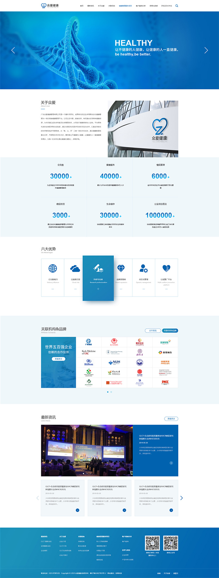 首頁主要展示了:關于眾愛、六大優(yōu)勢、關聯(lián)機構和品牌、新資訊四部分的內容,讓瀏覽者能夠全看的了解企業(yè)的實力優(yōu)勢同時,在欄目中加入了“健康管理服務項目”,幫助瀏覽者更好獲取健康方面知識,增加瀏覽者的逗留時間。