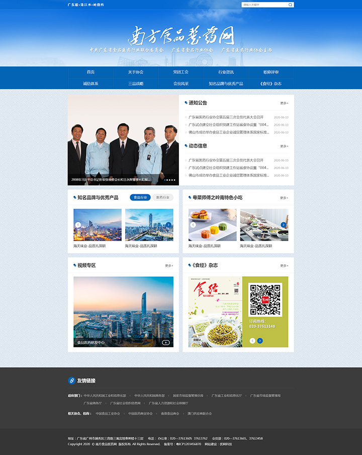 網(wǎng)站采用藍、白色作為主色調(diào),背景采用淺藍色的半圓紋理作為襯托,內(nèi)容區(qū)塊分明,使得整個頁面簡潔大氣,更加襯托出南方食品藥品協(xié)會的專業(yè)性。