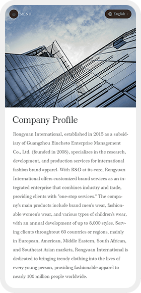榮緣國際成立于2015年,是2008年成立的廣州繽奇度企業(yè)管理有限公司的子公司。榮緣國際以研發(fā)設(shè)計(jì)為核心,為客戶提供定制化的品牌服務(wù),是集工貿(mào)于一體的“一站式服務(wù)”企業(yè)。 主要產(chǎn)品:品牌男裝、時(shí)尚女裝、各品類童裝等,年研發(fā)產(chǎn)品達(dá)8000款。 客戶遍布60個(gè)國家或地區(qū),主要銷往歐美、中東、南非及東南亞市場,致力于將潮流服飾帶入每一位年輕人的生活,為近億人提供時(shí)尚服飾。