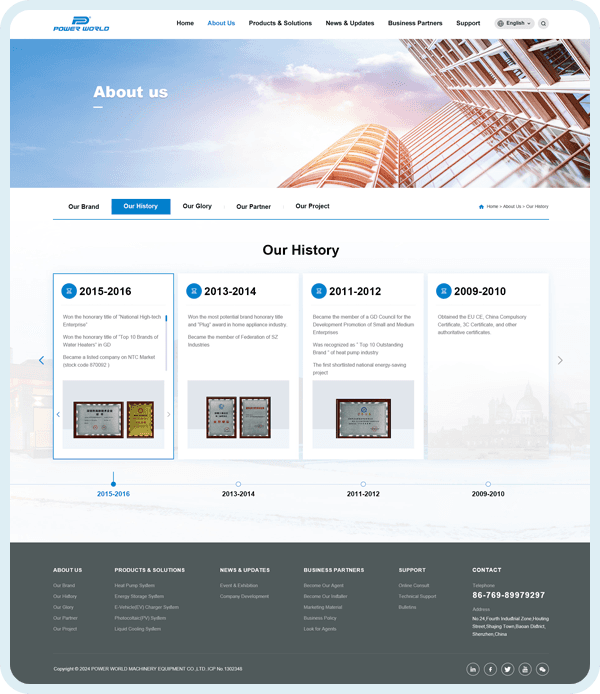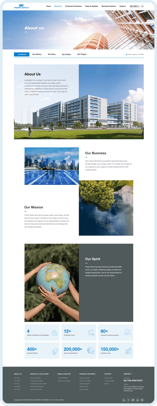 Specialized in new energy for more than 20 years, Power World, one of the leading global integrated new energy product manufacturers, has been focusing on high technology development, manufacturing, installment, one-stop services, and providing clean energy solutions for customers all over the world, which brings you a clean & cozy life style.