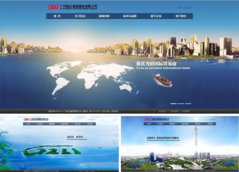 首頁設(shè)計重點展示集團實力,建立集團形象、傳達集團業(yè)務(wù)信息。采用開闊大氣版式,以沉穩(wěn)、厚重色彩、視野寬闊圖片來塑造集團形象。以乘風(fēng)破浪的大船在開闊的藍天下,廣袤的大海上譜寫出“GZLI”字樣,寓意輕出的遠大的使命和愿景;采用美化世界版圖、城市遠景寓意輕出國際貿(mào)易的業(yè)務(wù)形象;跳出大海的旭日寓意輕出的事業(yè)蓬勃發(fā)展!提供給瀏覽者愉悅的閱讀環(huán)境,讓用戶產(chǎn)生震撼感,留下深刻印象。