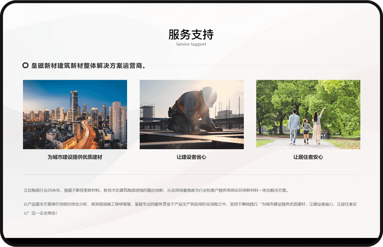 立足于陶瓷行業(yè)20余年,皇磁新材仍在不斷探索新材料、新技術(shù)在建筑陶瓷領(lǐng)域的融合創(chuàng)新,并組織來自新材研發(fā)、建筑設(shè)計、建筑幕墻等領(lǐng)域人才進行跨界創(chuàng)新,陸續(xù)推出園林景觀厚磚、陶瓷透水磚等環(huán)保新材,從應(yīng)用場景角度為行業(yè)和客戶提供系統(tǒng)化環(huán)保新材料解決方案。