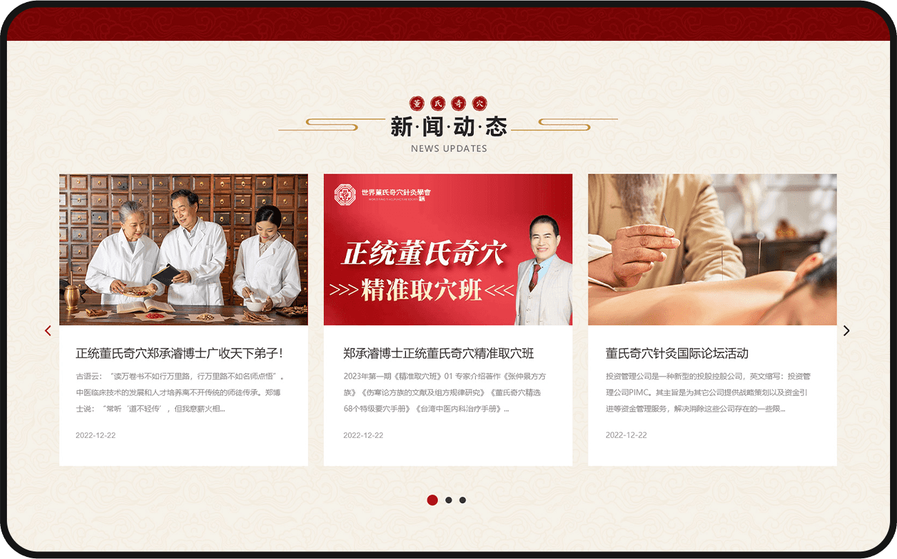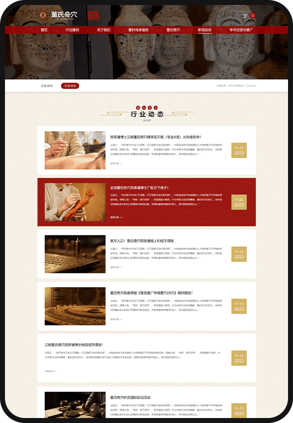 欄目框架清晰,“關(guān)于我們” 呈現(xiàn)合一堂發(fā)展歷程與董氏奇穴傳承脈絡(luò);“新聞中心” 實(shí)時(shí)更新義診、培訓(xùn)活動(dòng)及健康科普;“學(xué)術(shù)交流” 板塊聚焦中醫(yī)理論與臨床經(jīng)驗(yàn)分享。