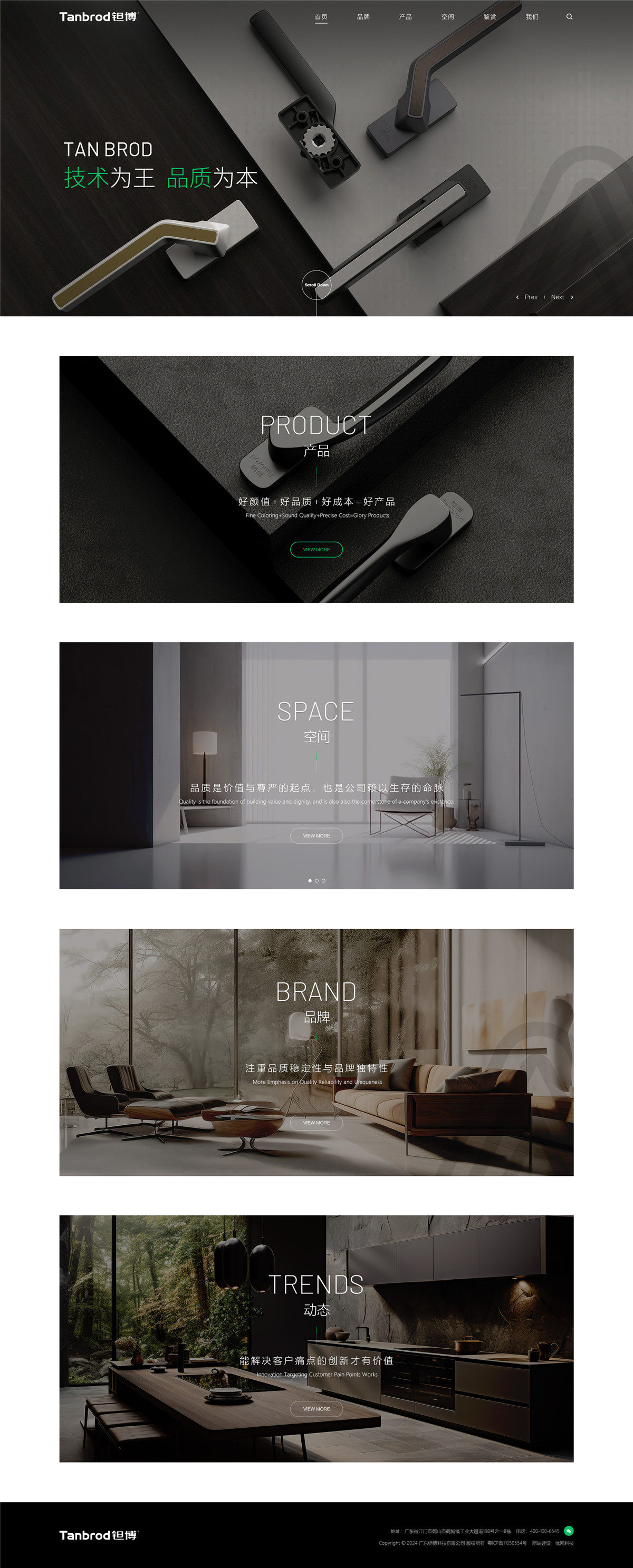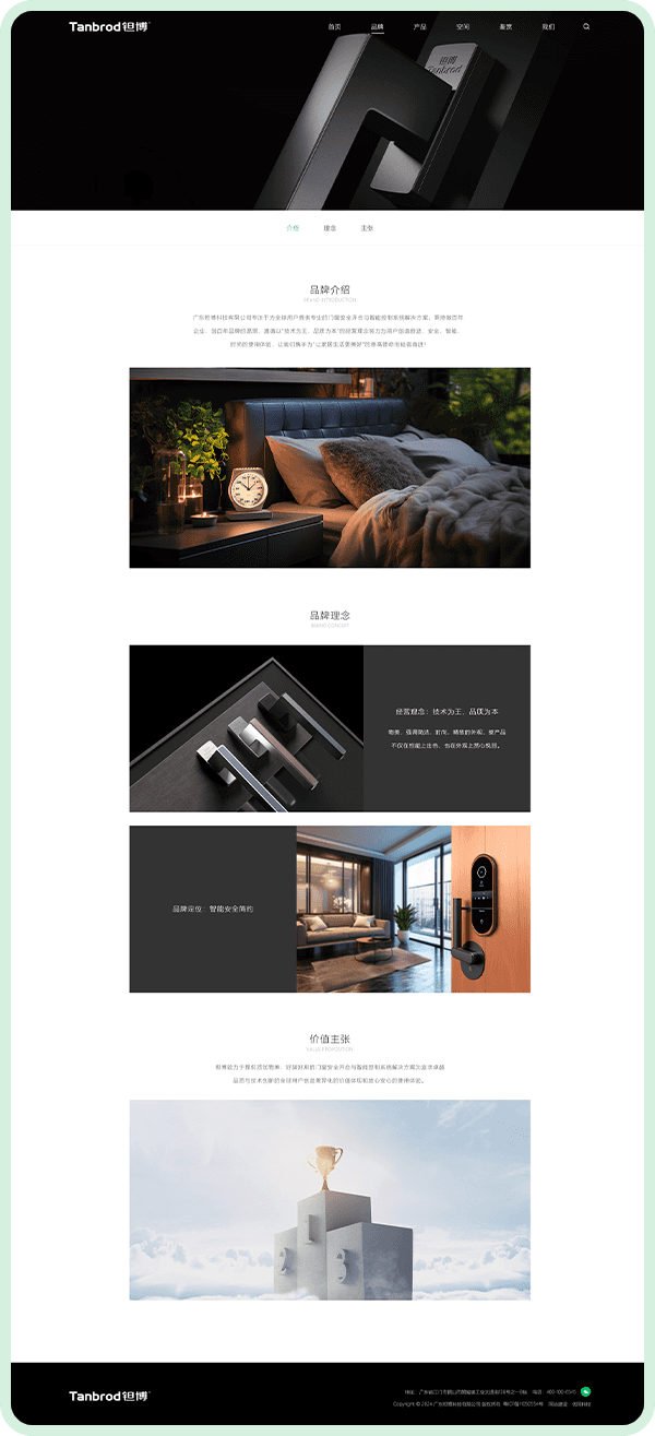鉭博門窗五金官方網(wǎng)站設(shè)計(jì)展現(xiàn)了品牌的獨(dú)特魅力,版面設(shè)計(jì)以深色調(diào)為主,營(yíng)造出一種高貴而沉穩(wěn)的氛圍,三個(gè)主要區(qū)域分別聚焦于品牌、產(chǎn)品和空間,整體布局清晰明了。