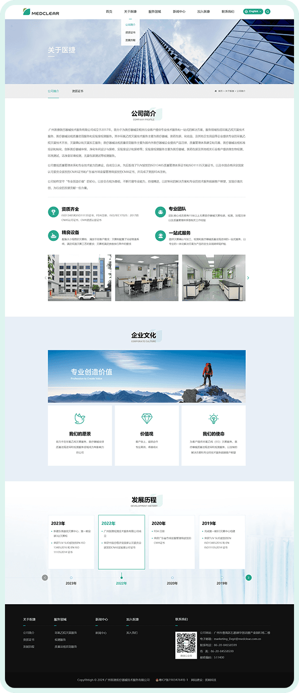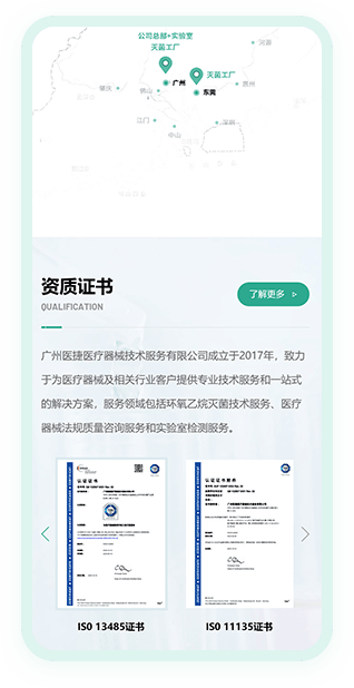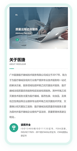 廣州醫(yī)捷醫(yī)療器械技術(shù)服務(wù)有限公司成立于2017年,致力于為醫(yī)療器械及相關(guān)行業(yè)客戶提供專業(yè)技術(shù)服務(wù)和一站式的解決方案,服務(wù)領(lǐng)域包括環(huán)氧乙烷滅菌技術(shù)服務(wù)、醫(yī)療器械法規(guī)質(zhì)量咨詢服務(wù)和實(shí)驗(yàn)室檢測(cè)服務(wù)。其中環(huán)氧乙烷滅菌技術(shù)服務(wù)主要為醫(yī)療器械、醫(yī)藥包裝、化妝品、及其他衛(wèi)生用品等企業(yè)提供專業(yè)的環(huán)氧乙烷滅菌技術(shù)開發(fā)、滅菌確認(rèn)和滅菌加工服務(wù);醫(yī)療器械法規(guī)質(zhì)量咨詢服務(wù)主要為國(guó)內(nèi)外醫(yī)療器械企業(yè)提供產(chǎn)品注冊(cè)、質(zhì)量管理體系建立和完善、醫(yī)療器械法規(guī)標(biāo)準(zhǔn)培訓(xùn)和轉(zhuǎn)化、創(chuàng)新醫(yī)療器械申報(bào)、凈化車間設(shè)計(jì)、實(shí)驗(yàn)室設(shè)計(jì)等;實(shí)驗(yàn)室檢測(cè)服務(wù)主要為醫(yī)療器械,醫(yī)藥包裝及其他相關(guān)行業(yè)客戶提供微生物檢測(cè),環(huán)殘測(cè)試,潔凈室環(huán)境檢測(cè),無(wú)菌包裝測(cè)試等檢測(cè)服務(wù)。