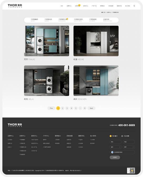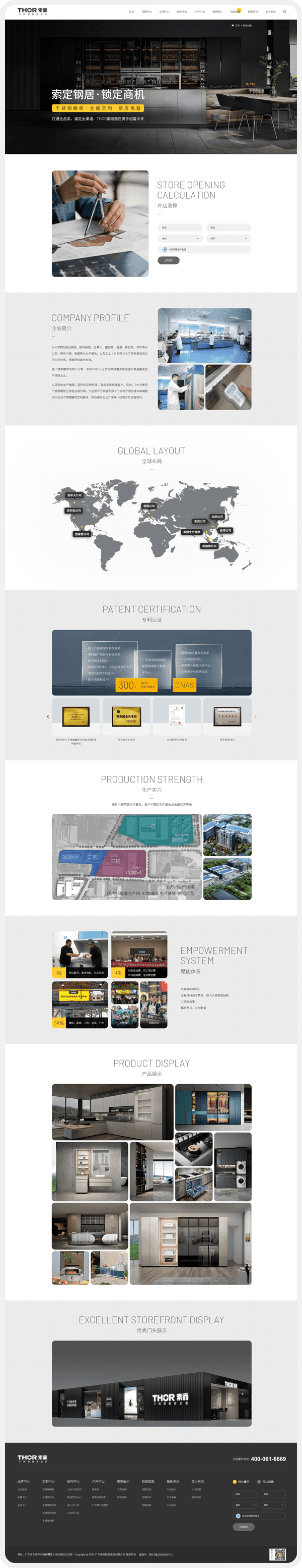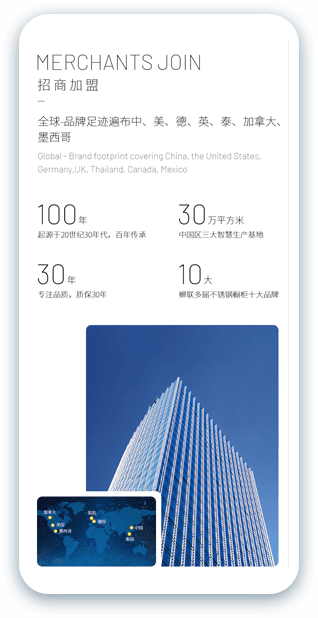 索而不銹鋼整家定制品牌官網(wǎng)在首頁(yè)設(shè)計(jì)上,巧妙運(yùn)用了品牌的LOGO VI色,并通過(guò)適當(dāng)?shù)牧舭谞I(yíng)造出產(chǎn)品的精致感和品質(zhì)感。首頁(yè)居中展示三大產(chǎn)品類別的精致大圖,布局統(tǒng)一、樣式簡(jiǎn)潔,充分展現(xiàn)了索而對(duì)產(chǎn)品品控的嚴(yán)格要求。緊隨其后的招商加盟板塊,則通過(guò)重點(diǎn)數(shù)據(jù)和全球布局地圖的呈現(xiàn),不僅展示了索而的服務(wù)范圍之廣,更凸顯了公司的雄厚實(shí)力。