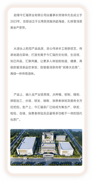 勐海今匯福茶業(yè)有限公司由董事長鄭清華先生成立于2023年,總部設(shè)立于云南西雙版納勐海縣,扎根普洱茶黃金產(chǎn)茶帶。從源頭上把控產(chǎn)品品質(zhì),匠心傳承手工制茶技藝,傳承地道白菜味;打造專屬于今匯福的文化館、生活館,知己共品,匯聚共贏,讓更多人體驗(yàn)到地道、健康、高級的普洱茶品飲享受;致敬普洱茶傳奇“班章大白菜”,再續(xù)一杯傳奇滋味。