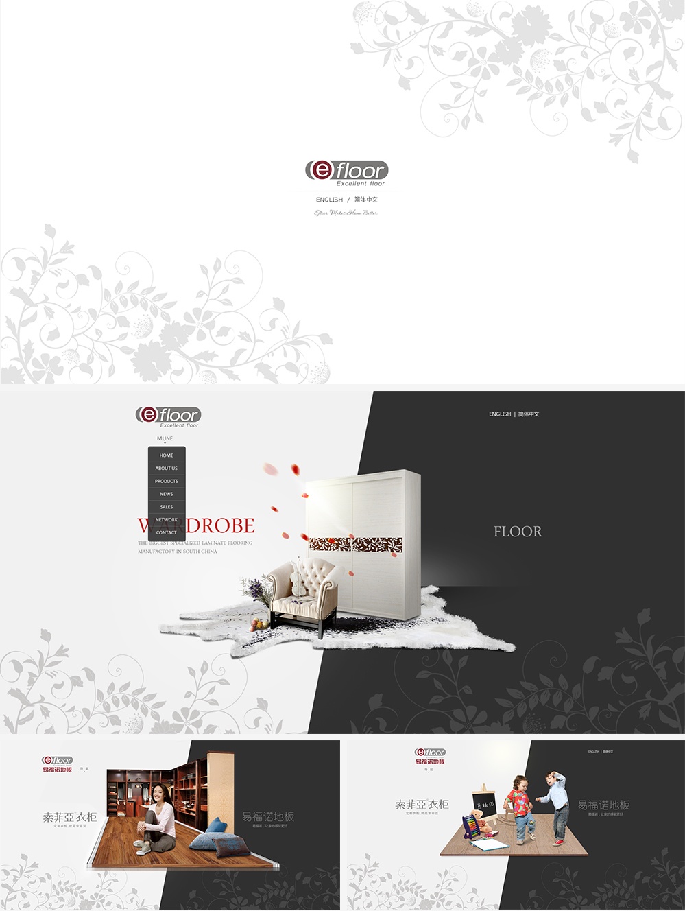 在點(diǎn)擊進(jìn)入網(wǎng)站一剎那,映入眼簾的是優(yōu)雅的雙語(yǔ)版本引導(dǎo)頁(yè),中英文版產(chǎn)品各異,首頁(yè)動(dòng)態(tài)引導(dǎo)進(jìn)入對(duì)應(yīng)產(chǎn)品網(wǎng)站。嘗試點(diǎn)擊進(jìn)英文版體驗(yàn),具有科技之色的灰色結(jié)合沉穩(wěn)的黑色雙拼,滑動(dòng)鼠標(biāo)能把場(chǎng)景直接切換選擇地板項(xiàng)目,“易福諾,讓家的感覺(jué)更好”品牌倡導(dǎo)語(yǔ),使人印象深刻。巧妙的場(chǎng)景推導(dǎo),使瀏覽者更好地根據(jù)喜好及目標(biāo)進(jìn)入不同層面探究體驗(yàn)易福諾地板的精妙。
