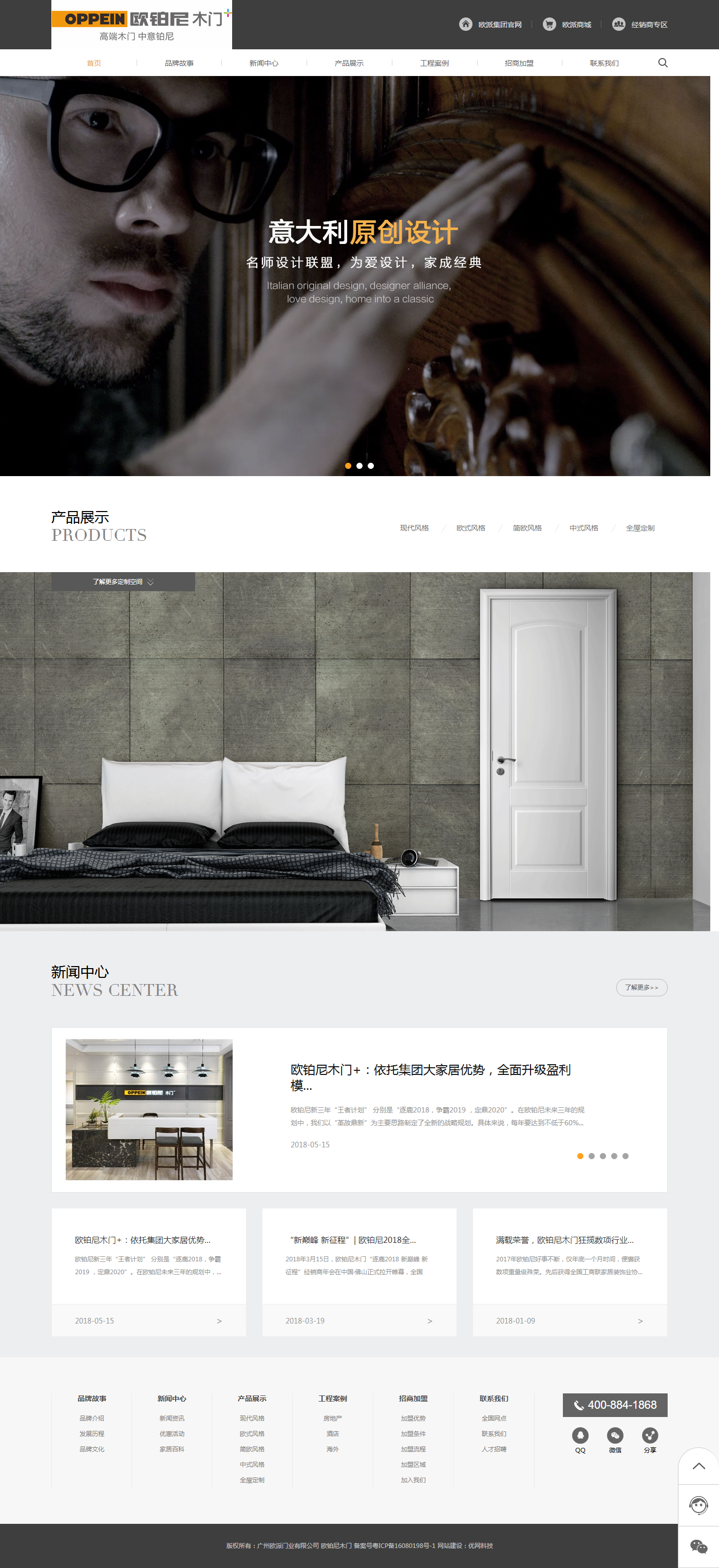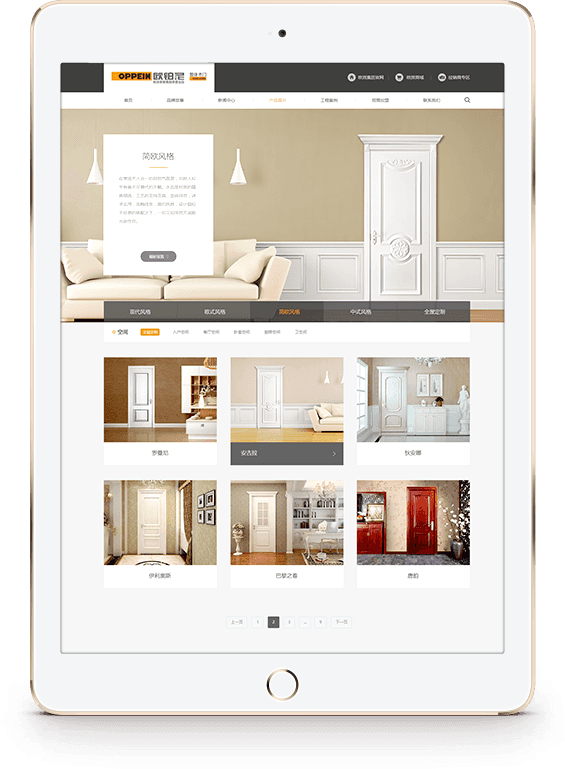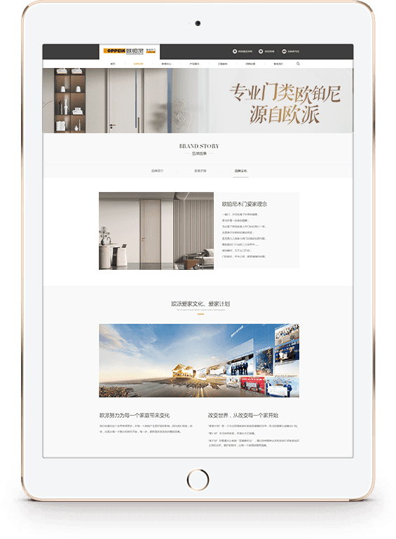 歐鉑尼木門品牌網(wǎng)站與集團官網(wǎng)風(fēng)格保持一致,首頁采用全屏的banner主題大圖,簡約大氣的視覺設(shè)計界面體現(xiàn)出品牌的“愛家”理念,在產(chǎn)品展示方面,以大圖展示的方式,設(shè)置產(chǎn)品不同風(fēng)格以及不同空間的查看方式,給予用戶的瀏覽體驗。