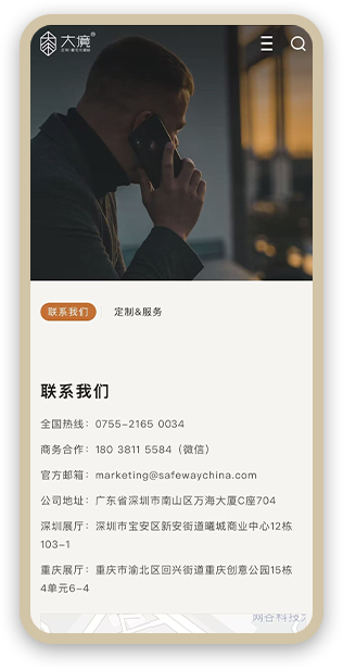 網(wǎng)站欄目框架清晰,頂部設(shè)首頁 Banner 強(qiáng)化品牌 “手工定制,專為大宅而生” 的定位,中間分區(qū)域展示三大產(chǎn)品系列,底部突出商務(wù)聯(lián)系方式。