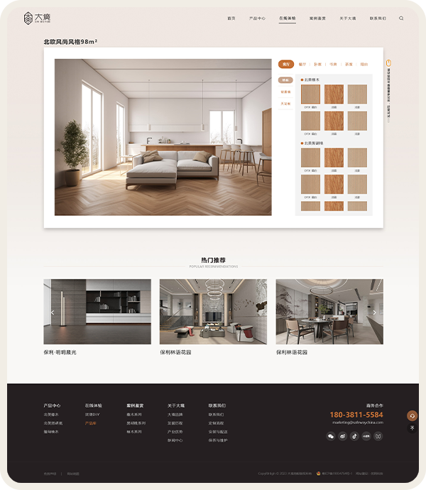 在線 DIY 體驗(yàn)功能:作為核心亮點(diǎn),該功能允許用戶自由搭配三大產(chǎn)品系列的花色與風(fēng)格,直觀預(yù)覽不同場景下的地板效果。用戶無需專業(yè)設(shè)計(jì)知識,即可輕松實(shí)現(xiàn)個(gè)性化搭配,既增強(qiáng)了參與感,又降低了決策門檻,有效提升了產(chǎn)品轉(zhuǎn)化可能性。