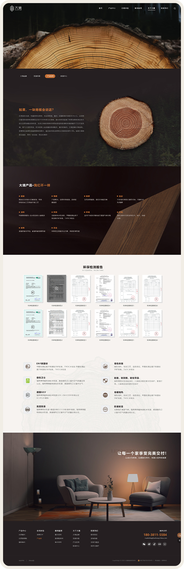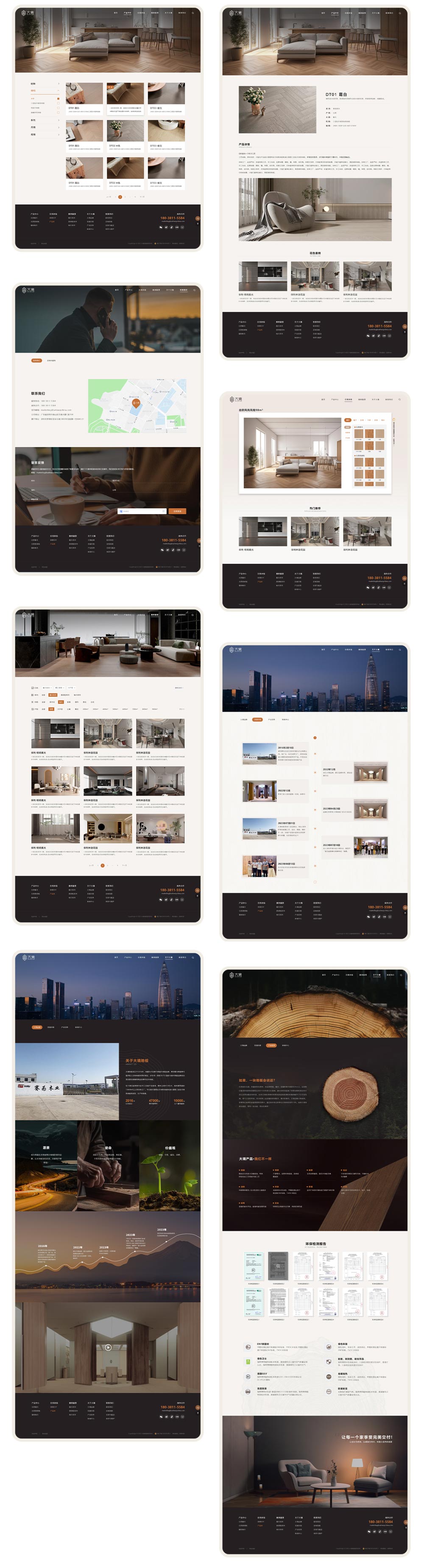 設(shè)計(jì)以深色為主色調(diào),契合高端定位,搭配暖色調(diào)燈光效果,營造出優(yōu)雅舒適的氛圍,凸顯木材的自然質(zhì)感。圖片選取上,三大產(chǎn)品系列采用特寫與場景結(jié)合的展示方式,橡木的溫潤、柚木的大氣、黑胡桃的內(nèi)斂通過光影對比呈現(xiàn),色調(diào)與產(chǎn)品特性呼應(yīng),視覺上形成統(tǒng)一且富有層次的美感。