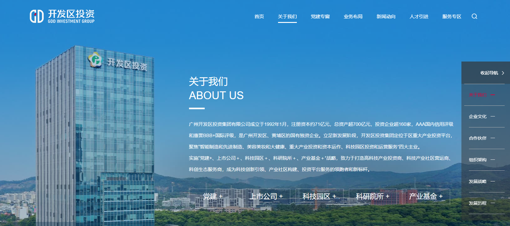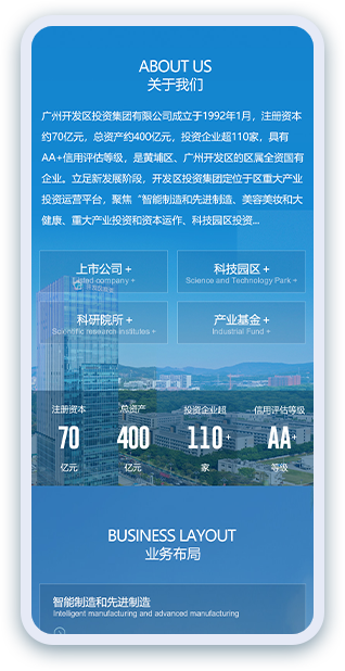 廣州開發(fā)區(qū)投資集團(tuán)有限公司成立于1992年1月,注冊資本約71億元,總資產(chǎn)超700億元,投資企業(yè)超160家,AAA國內(nèi)信用評級和惠譽(yù)BBB+國際評級,是廣州開發(fā)區(qū)、黃埔區(qū)的國有獨(dú)資企業(yè)。立足新發(fā)展階段,開發(fā)區(qū)投資集團(tuán)定位于區(qū)重大產(chǎn)業(yè)投資平臺,聚焦“智能制造和先進(jìn)制造、美容美妝和大健康、重大產(chǎn)業(yè)投資和資本運(yùn)作、科技園區(qū)投資和運(yùn)營服務(wù)”四大主業(yè)。