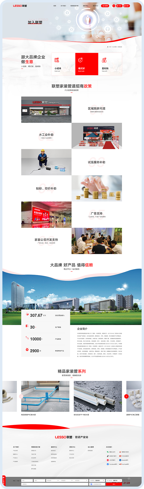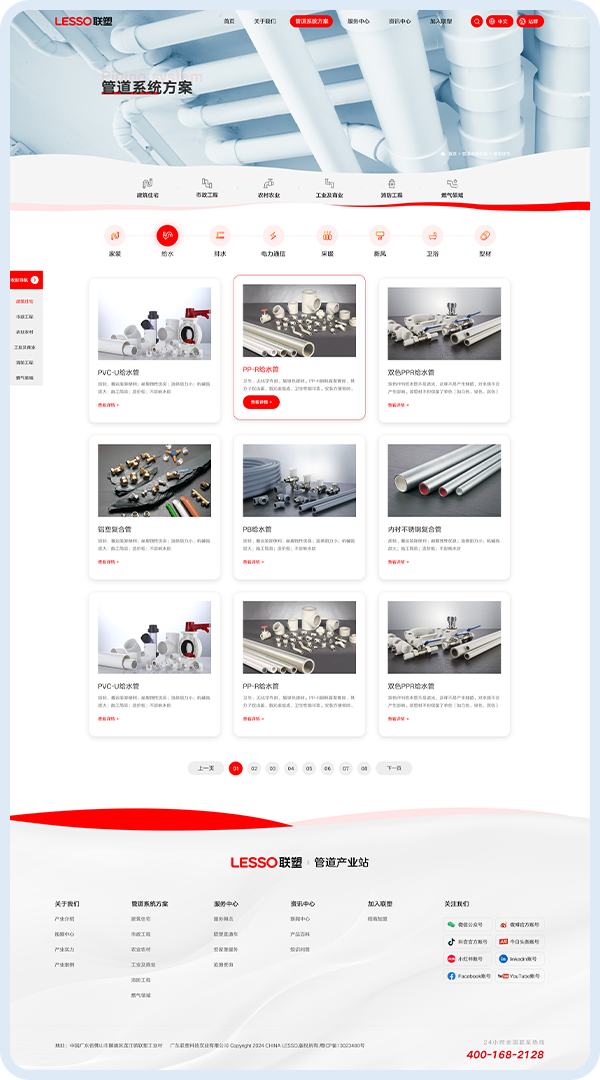 該網(wǎng)站是LESSO 聯(lián)塑管道品牌的官方網(wǎng)站,聚焦管道產(chǎn)業(yè),覆蓋市政工程、建筑住宅、農(nóng)業(yè)農(nóng)村、工業(yè)及商業(yè)、消防工程、燃?xì)忸I(lǐng)域等多應(yīng)用場景,在網(wǎng)站上展示其全品類管道產(chǎn)品及服務(wù)。企業(yè)憑借技術(shù)實力屢獲殊榮,網(wǎng)站作為品牌的重要窗口,既呈現(xiàn)產(chǎn)品體系,也要傳遞 “專業(yè)、安全、可靠” 的品牌理念,所以建造一個好的管道官網(wǎng)至關(guān)重要。