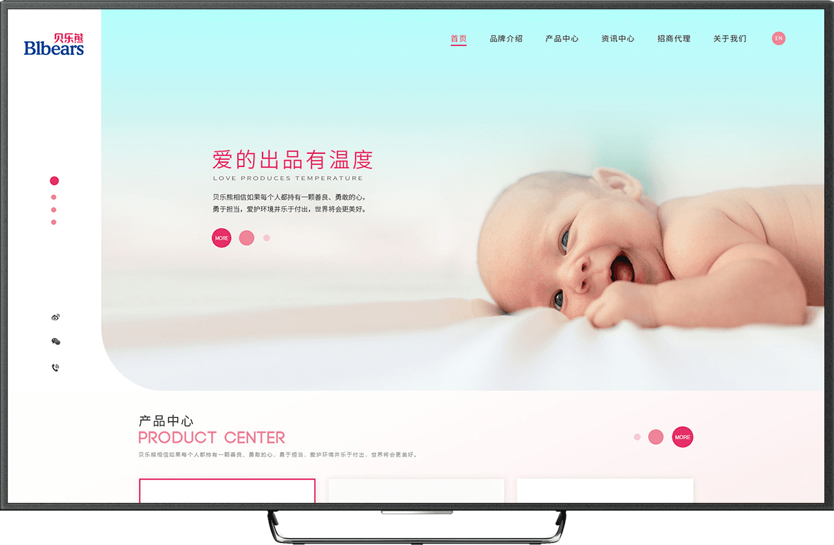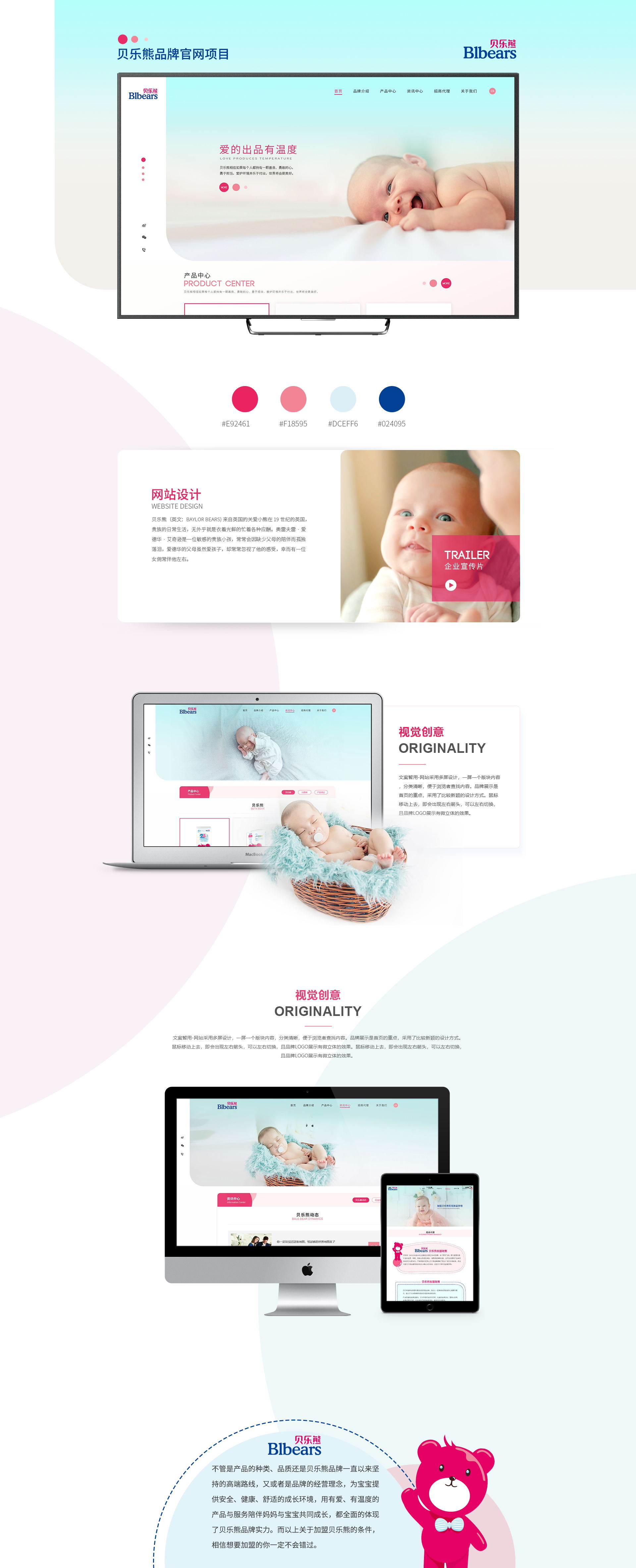 網(wǎng)站以VI暖色桃粉色為主色調(diào),網(wǎng)頁設(shè)計風(fēng)格體現(xiàn)了品牌的溫馨簡約。整體布局新穎大氣,內(nèi)容布局展示符合用戶瀏覽習(xí)慣;基于母嬰產(chǎn)品的性質(zhì),頁面多采用圓弧、圓等圖形設(shè)計點綴,與企業(yè)產(chǎn)品性質(zhì)做出呼應(yīng),營造活力、溫暖的氣氛。