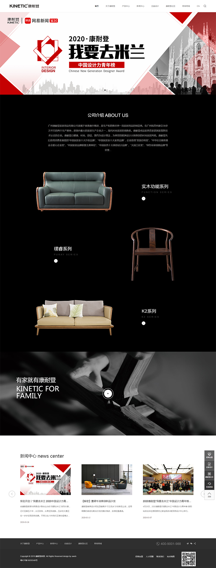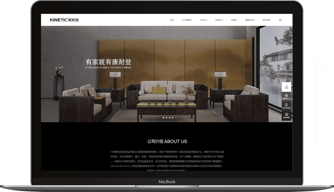 網(wǎng)站設計色調(diào)運用VI的黑色為主,襯托出家具的高端設計感。整體的頁面采用簡約大氣手法進行設計,產(chǎn)品中心采用簡約的黑底圖文搭配精美的產(chǎn)品,展示簡約時尚的設計感,顯得整個畫面更加美觀舒適。新聞中心采用等比例分割的形式進行設計,保持版面的整體感同時,加入簡單的交互效果,使得整個頁面更為協(xié)調(diào)舒適。