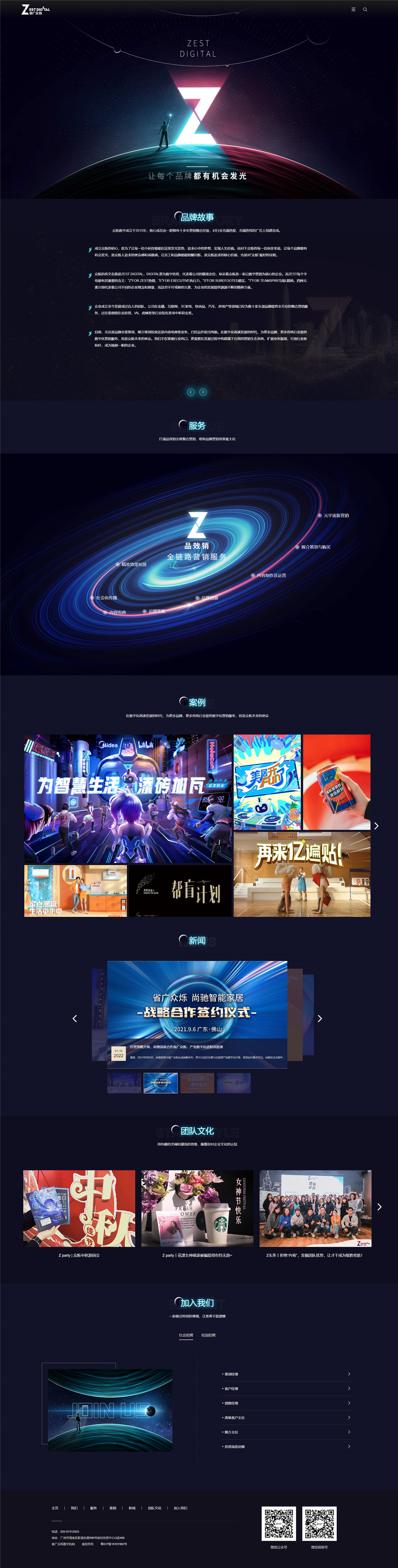 整體官網(wǎng)設(shè)計(jì)采用深色調(diào)為主,運(yùn)用星空主題與省廣眾爍的slogan呼應(yīng),運(yùn)用冰藍(lán)色和冰粉色來(lái)進(jìn)行點(diǎn)綴。BANNER采用人和字母Z來(lái)搭配設(shè)計(jì),對(duì)眾爍的理念“讓每個(gè)品牌都有機(jī)會(huì)發(fā)光”進(jìn)行寓意創(chuàng)意。營(yíng)銷服務(wù)區(qū)域,采用幾大服務(wù)形成閉環(huán)環(huán)繞的方式設(shè)計(jì),與整站主題進(jìn)行呼應(yīng)。鼠標(biāo)移動(dòng)到對(duì)應(yīng)的服務(wù),則自動(dòng)出現(xiàn)服務(wù)的相關(guān)介紹,便于用戶瀏覽。