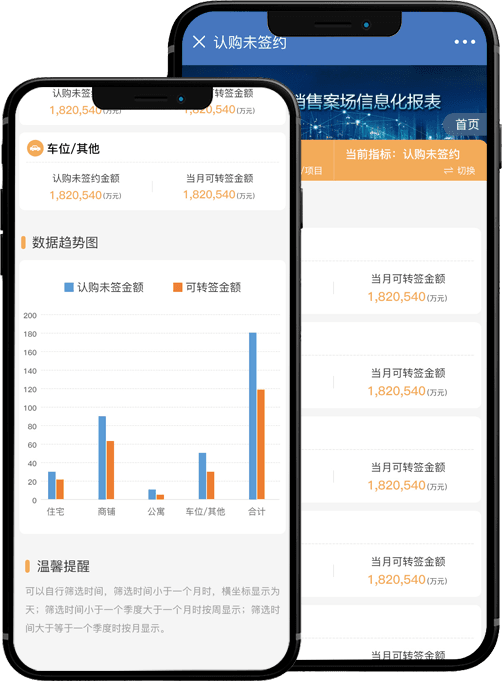 展示的數(shù)據(jù)為當(dāng)日統(tǒng)計(jì)出來的認(rèn)購未簽約金額和可轉(zhuǎn)簽金額的數(shù)據(jù)對比。以柱狀圖的形式進(jìn)行當(dāng)天認(rèn)購未簽約金額和可轉(zhuǎn)簽金額的數(shù)據(jù)對比。