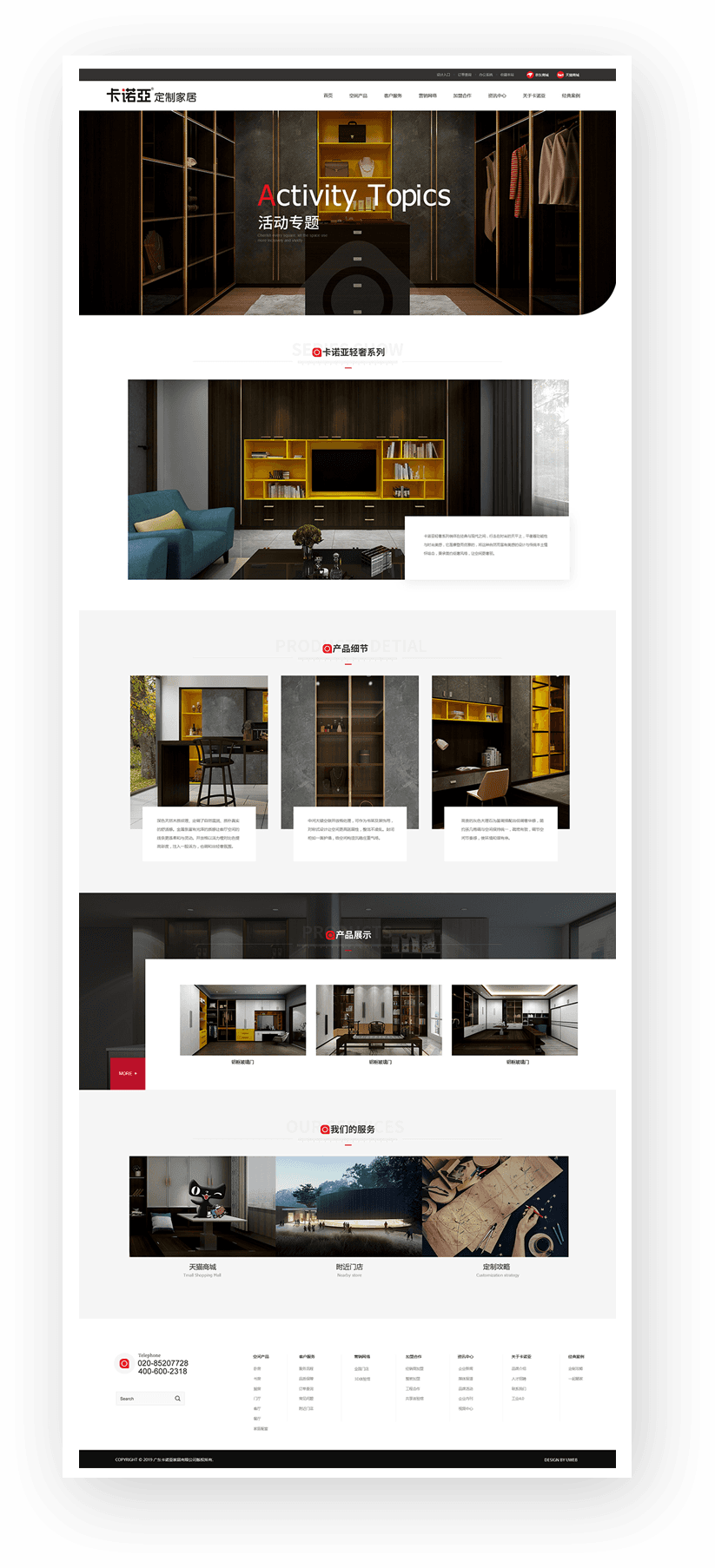 卡諾亞作為具有一定知名度的品牌,家居定制產(chǎn)品具有多樣化,品牌產(chǎn)品涵蓋5大基材、6大空間、7大風(fēng)格及20多個系列,主要包括衣柜、書柜、廚柜…此次官網(wǎng)建設(shè)融合品牌理念“打造中國至好的定制家居品牌”在網(wǎng)站設(shè)計中極具形象地體現(xiàn)。
