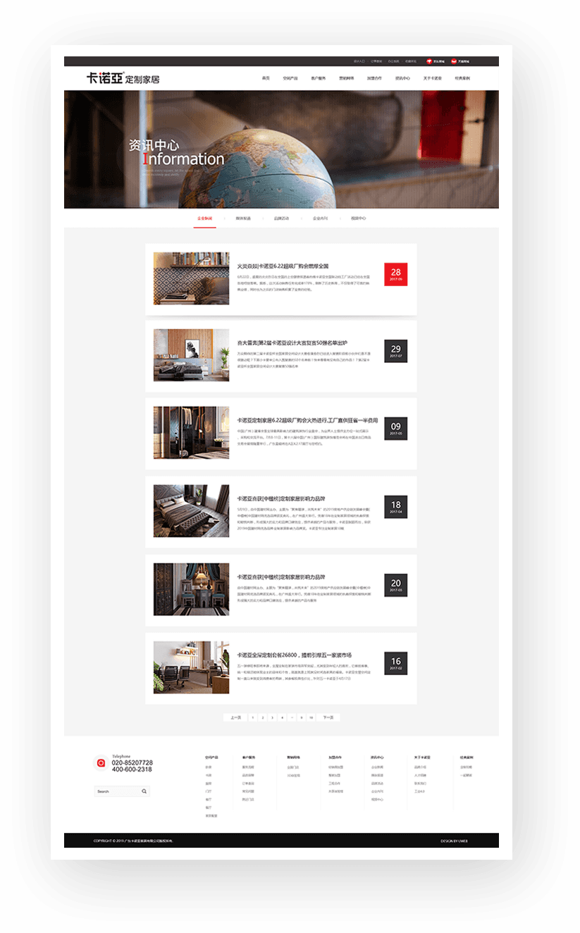首頁“banner”圖,空間定制、品牌實力、資訊中心、加盟合作、客戶服務(wù)等幾大版塊構(gòu)成頁面的整體展示,通過運用圖片和文字結(jié)合的效果,能夠在一定程度上吸引用戶的關(guān)注,并且直觀的展示了卡諾亞的品牌形象。