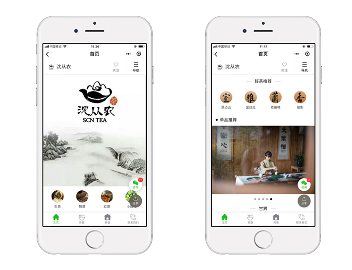 沈從農(nóng)小程序開發(fā)的頁面設計結合了中國水墨畫的元素作為背景,與茶葉生長的環(huán)境相契合,凸顯出茶葉特色;圖標的選用和設計上融入了毛筆字,濃濃的中國元素體現(xiàn)出沈從農(nóng)茶葉的高雅與腔調(diào),圖標結合不同類型茶葉圖片等前端交互設計,增加了交互的趣味性以及引導性,符合沈從農(nóng)推廣茶文化的初衷。