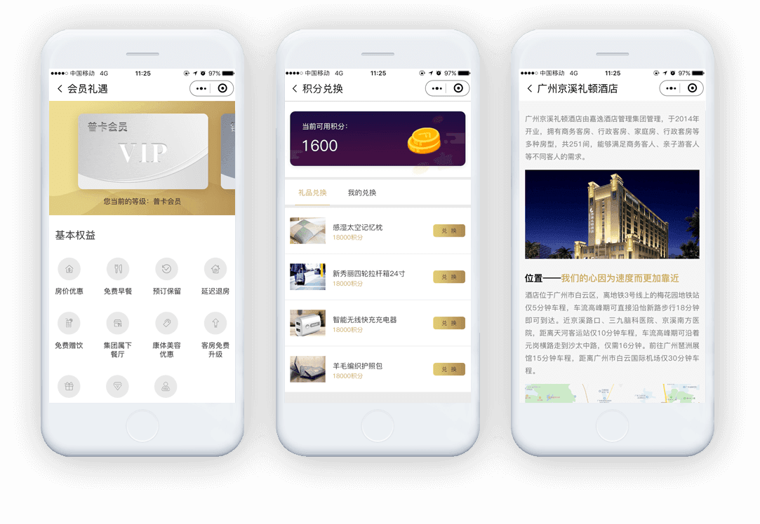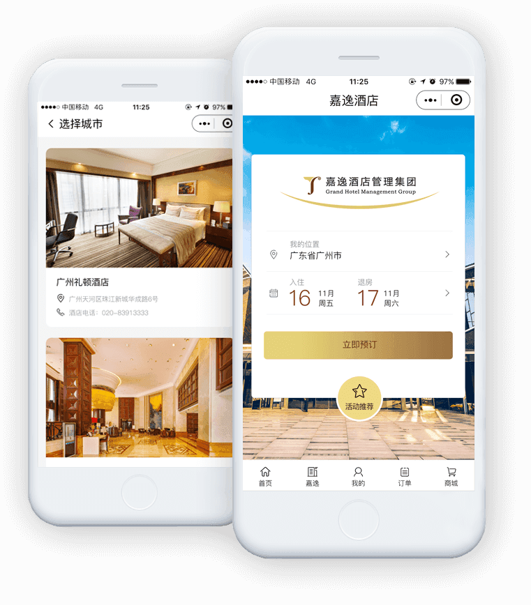 小程序建設(shè)的功能涵蓋的比較全面,以酒店預(yù)訂為主,用戶可以通過位置、時間點擊預(yù)訂,通過位置推薦近的酒店供選擇,酒店選定之后用戶可以預(yù)訂房間號,可以通過微信支付或者前臺支付的方式付款。嘉逸主要展示酒店的信息,通過信息展示,讓客戶更加了解酒店的信息。另外還有其他的信息包括積分兌換、訂單中心、會員禮遇等等提供給用戶相應(yīng)的服務(wù)。