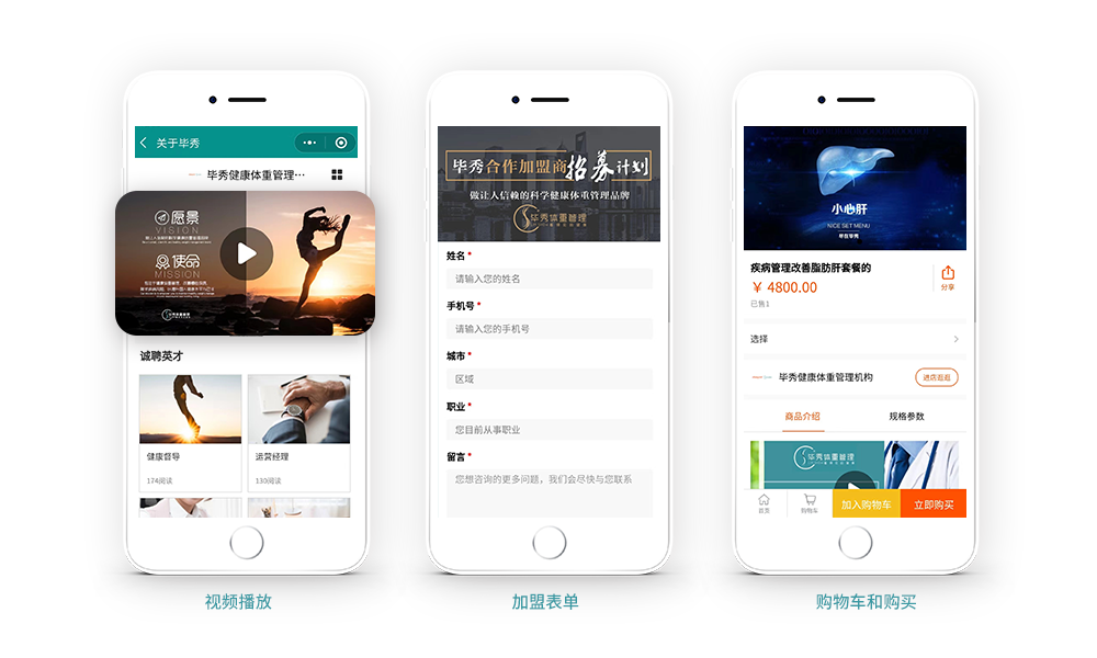 用戶進入首頁會顯示輪播畫面,可以實時查看新的消息,用戶點擊后會自動跳轉相應的鏈接,在用戶查看信息的過程中,還能通過視頻來詳細進一步了解項目的價值。提供購物車和購買的功能,能在時間內(nèi),抓取消費者的心里,引導用戶購買產(chǎn)品。用戶可查看商品的詳細信息,包括商品主圖,介紹,價格,規(guī)格等來確認自己的需求情況。另外提供加盟表單的功能,能讓企業(yè)快速獲取合作者的加盟信息。