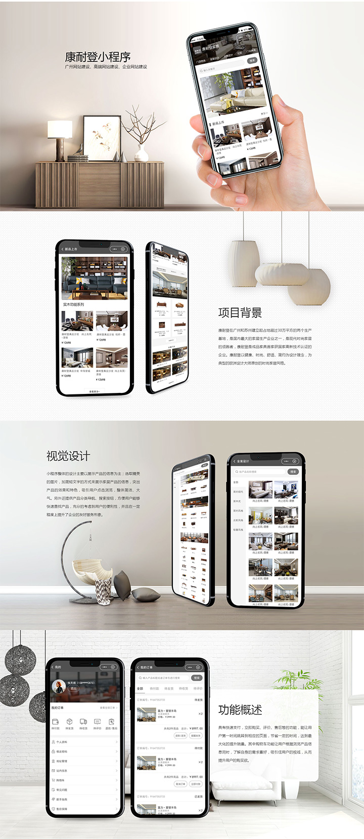 小程序整體的設計主要以展示產品的信息為主;選取精美的圖片,加簡短文字的方式來展示家居產品的信息,突出產品的效果和特色,吸引用戶點擊瀏覽,整體簡潔、大氣。另外還提供產品分類導航、搜索按鈕,方便用戶能夠快速查找產品,充分的考慮到用戶的便利性,并且在一定程度上提升了企業(yè)的友好服務形象。