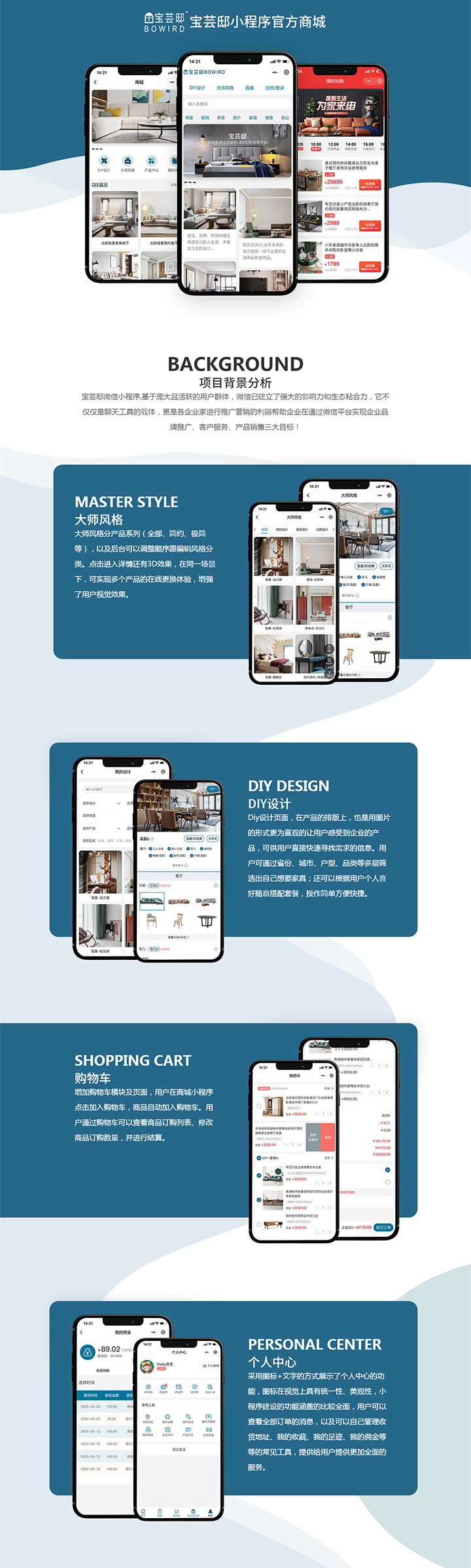 Diy設(shè)計(jì)頁(yè)面,在產(chǎn)品的排版上,也是用圖片的形式更為直觀的讓用戶(hù)感受到企業(yè)的產(chǎn)品,可供用戶(hù)直接快速尋找需求的信息。用戶(hù)可通過(guò)省份、城市、戶(hù)型、品類(lèi)等多層篩選出自己想要家具;還可以根據(jù)用戶(hù)個(gè)人喜好隨意搭配套餐,操作簡(jiǎn)單方便快捷。