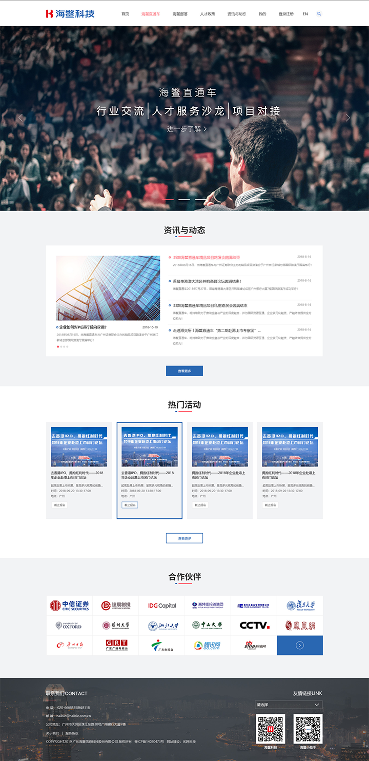 整體頁面設計排版清晰,主要展示公司的旗下的海鱉直通車和海鱉部落的兩大板塊,海鱉直通車采用活動報名的外鏈顯示展示公司的活動情況;通過申請報名的表單申請來讓客戶深入地了解海鱉部落這個版塊,起到了推廣和宣傳了的作用。