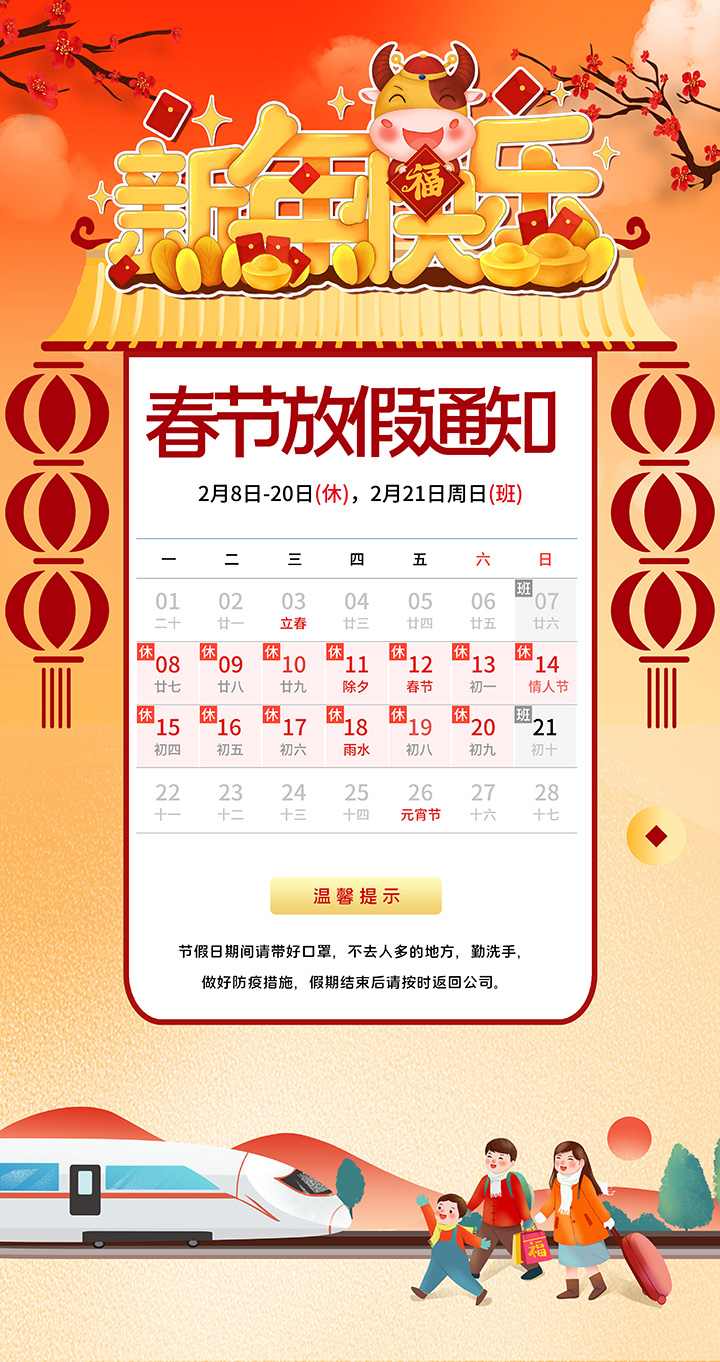 根据国务院办公厅关于2021年春节放假安排,结合公司实际情况,现将2021年春节放假安排如下:从2月8日至2月20日止,共13天。于2月21日(初十)正常上班。