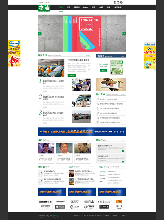 网站首页以LOGO绿色和黑色进行搭配,整体显得大气简约,首页内容丰富,主要分为三大部分,部分是BANNER,这里可以放置多张资讯图片进行切换显示,主题直观明了哟;第二部分是资讯,可以在此区域查看新资讯、当期杂志和热门文章,内容清晰明了;第三部分是省物流杂志所提供的专业物流信息,有专栏、供需、话题、俱乐部和研究,浏览者可在此查看专业物流人士的文章、热门的物流话题并参与探讨以及参与俱乐部里的活动等,充分的了解物流方面的专业知识,简直是知识能量爆棚啊!