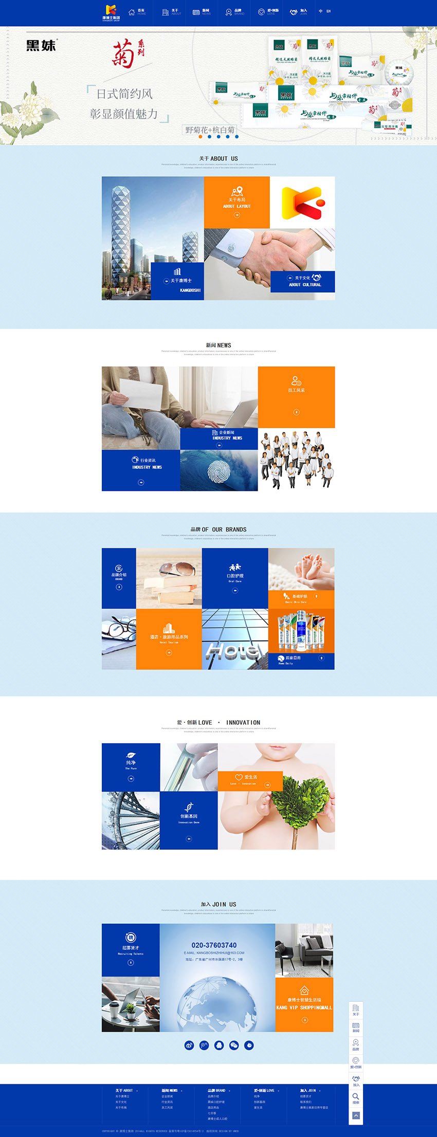 近日,优网科技为康博士制作的形象官网上线开通了,小优现在就带大家一起来看看这高颜值的网站究竟长啥模样。网站分为5大栏目:关于、新闻、品牌、爱创新和加入。首页的设计布局也是根据这5大栏目来分布的,每个区域包含了单个栏目里的栏目内容,浏览者可按自身需求点击进入查看。同时,为了提供更便捷的区域切换,在网站右侧增加了5大栏目的快速导航条,浏览者可快速的去到所点击的区域。