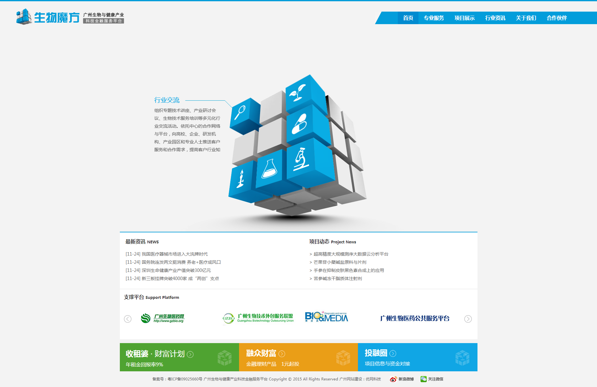 广州生物工程中心是广州市科技创新委直属事业单位,是专注于生物与健康领域的科技服务机构。此次与我们优网科技合作的项目是“广州生物与健康产业科技金融服务平台”网站的建设。该平台主要的目的是为促进生物科技和金融紧密结合,拓宽科技金融服务的渠道,主要服务科技金融需求主体,科技型中小企业是科技金融的主要需求方。