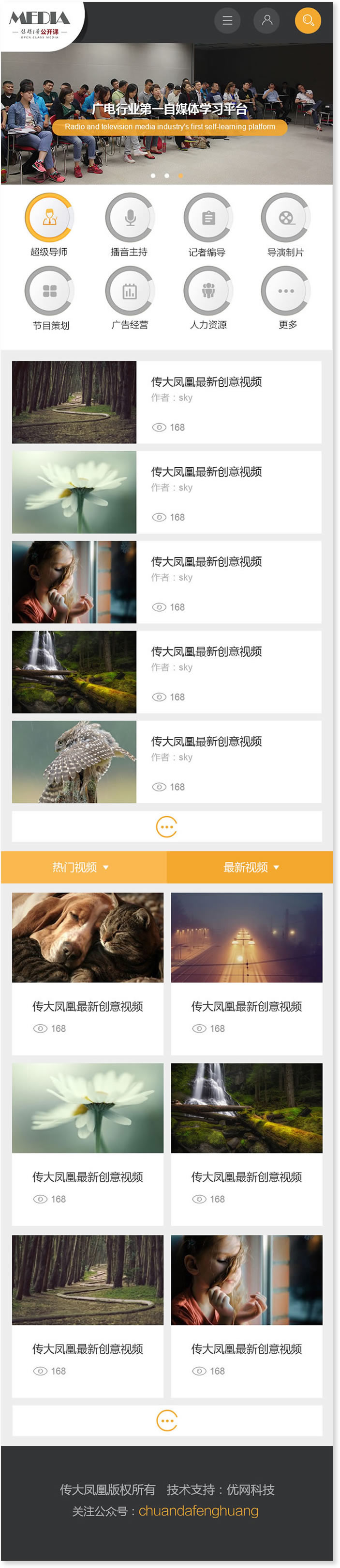 今天优网科技小优就来给大家介绍一下传媒1号手机站,手机网站设计的风格以简约为主,配色方面用LOGO灰色和橙色点缀搭配,让视频信息整齐罗列显示,并且有主次重点。