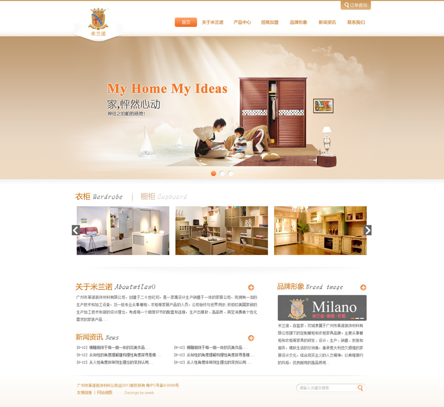 网站是典型的品牌形象展示型网站的风格,符合米兰诺衣柜的简洁、高端的形象。整站以LOGO色为主色调进行搭配,大幅BANNER既可以展现米兰诺的品牌形象,又可以发布新活动,吸引浏览者浏览。对比旧版网站,是一个质的飞跃。中间产品展示以衣柜和橱柜两大类进行区分,并且,产品图可以左右切换查看,便于做多个热门产品首页推荐。