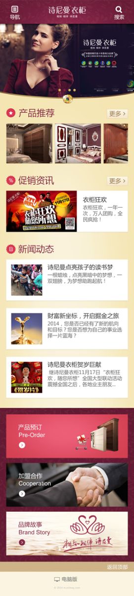 广州市诗意家具有限公司旗下品牌诗尼曼衣柜的手机网站建设项目于近日开通上线!随着移动终端及及移动网络环境(3G、WIFI等)的升级,使用手机查看网页和上网的人也会越来越多,应用也越来越广泛,能让消费者随时、随地、随身访问的优势和方便快捷。手机网站建设领域将会为企业公司带来巨大的利益。建立专供手机上网浏览的网站,让客户真正能实现实现随时、随地、随身的访问。诗尼曼衣柜品牌的建设在不断扩大,加强,结合移动端为客户带来更好的服务势在必行。