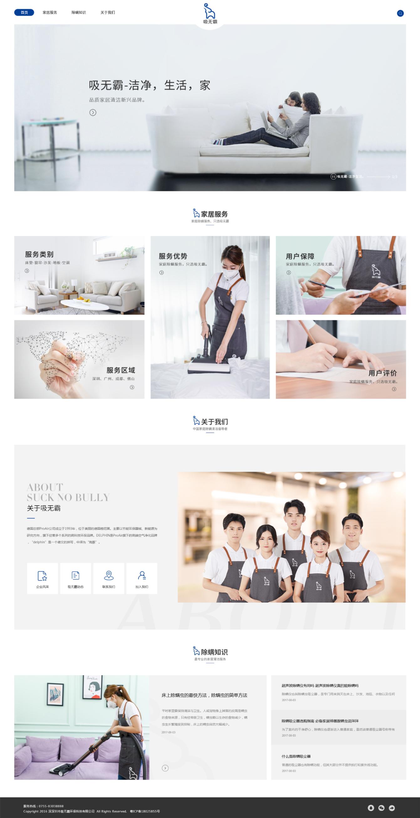 深圳市吸无霸环保科技有限公司官方网站建设项目开通上线了! 目的为了能进一步推广吸无霸除螨服务的业务,让更多有需要客户联系吸无霸专业团队做家庭除螨活动。整体网页设计采用时尚、简约的风格,版面做适当的留白以体现吸无霸品牌的行业特性,突出贴心服务的理念。在色调方面,以浅灰色为主体颜色,深灰色做辅助色,搭配LOGO VI蓝色做点缀色,从细节带出企业文化元素,体现吸无霸服务细致,追求精致的服务态度。首页以业务服务模块介绍、关于我们、行业知识新闻三大板块构成,每一个板块之间的区分都以标准的分割线划分,板块标题还呈现服务理念,精致且简约。主题内容布局打破常规的尺寸,以新颖的宽屏展示,更多内容可点击图标或图片进入查看详情,整体设计符合用户浏览习惯。