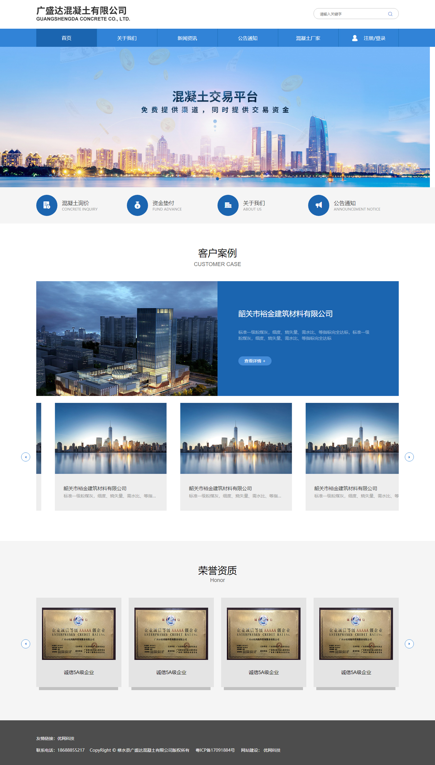 在BANNER图上标记公司的服务广告语,凸显出公司的服务内容,同时底部的小按钮入口,让用户能够方便点击进入查看对应的内容。混凝土之家主要是用户注册之后发布混凝土的价格,展示混凝土的附近地址,能够让用户了解到具体的混凝土价格等信息。公告通知栏目主要是方便建筑商发布公告,做到信息交互的作用。网站建设的功能涵盖的比较全面,通过展示客户的案例、荣誉资质,体现平台的重要性。