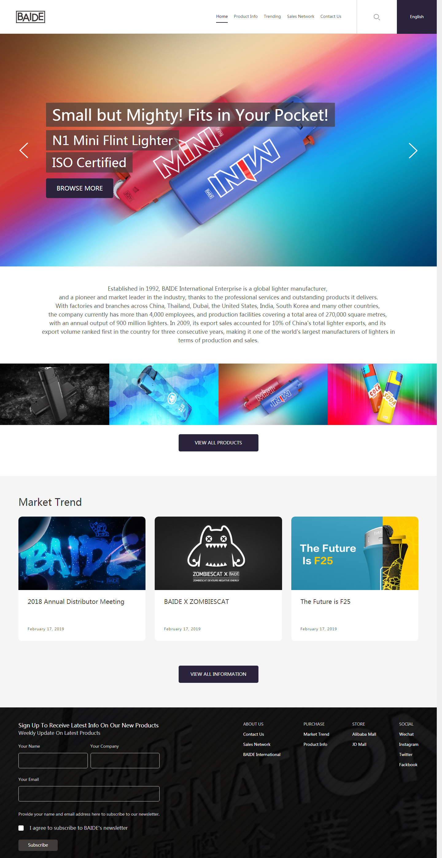 百得国际企业网站建设项目开通上线啦!网页用色主要结合logoVI,以黑色搭配白色,配合品牌logo进行细微的页面点缀,加上充满层次感的排版,更凸显品牌精简的的风格。网站建设整体体现了品牌的国际化和简约的风格,重点展示百得引以为傲的打火机产品;banner图设计突显产品特点,以打火机原有色彩做延伸设计,颇具未来感,抓住用户眼球;网站建设主要展示了百得产品及资讯,有效增加用户访问量。