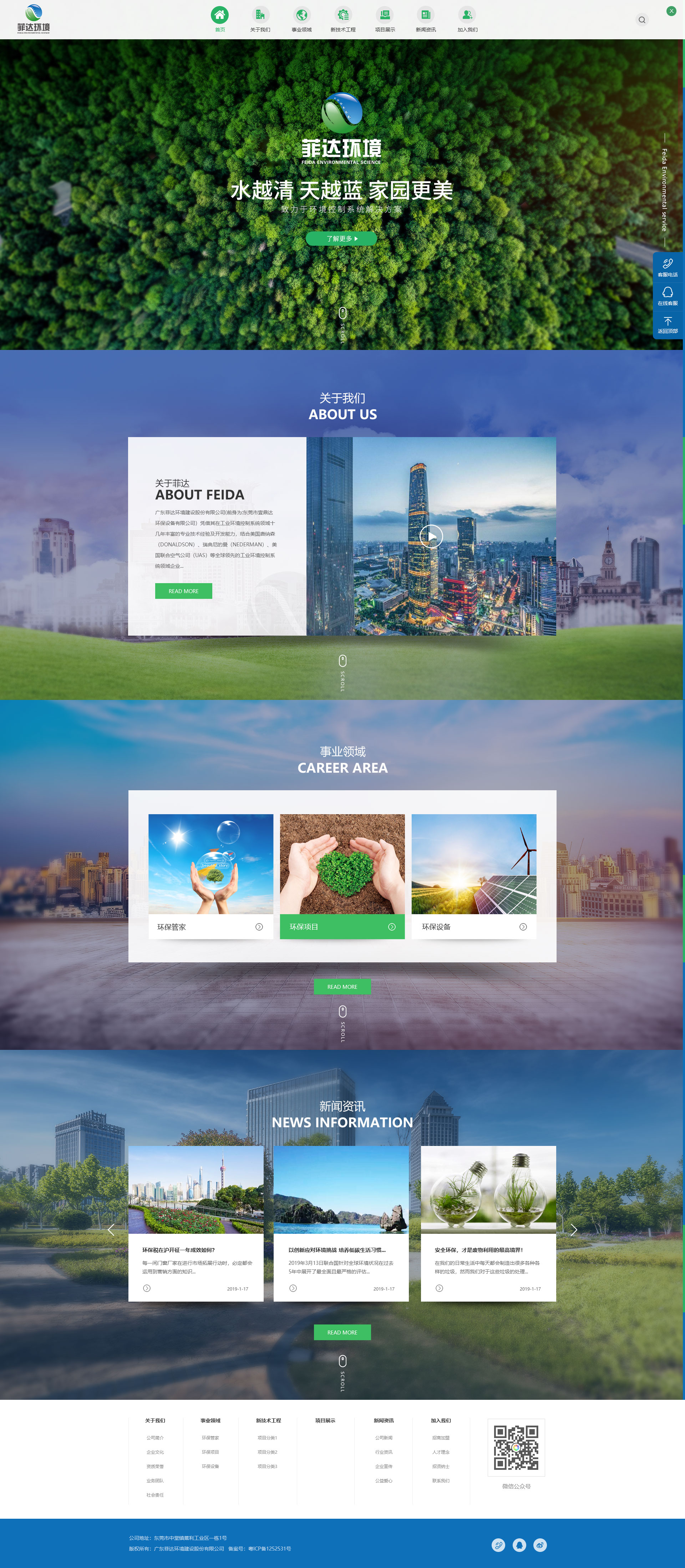 菲达环境广州网站建设项目开通上线啦!广东菲达环境建设股份有限公司与优网科技的愉快合作下顺利完成本次的广州网站建设。网站风格以专业、大气为主,凸显公司文化理念,新颖的首页单屏滚动切换的展现形式,使网站整体更上档次。网页设计上以绿色和蓝色为主色调搭配呼应logo色彩,表达出公司的发展理念。栏目页设计简洁大方,简单明了的让用户更好的找寻自己需要的信息。首页上分成四大板块,分别是“banner”“关于我们”“事业领域”“新闻资讯”等信息,清晰的表达,让浏览者一目了然,突出的展现了菲达企业的整体形象。