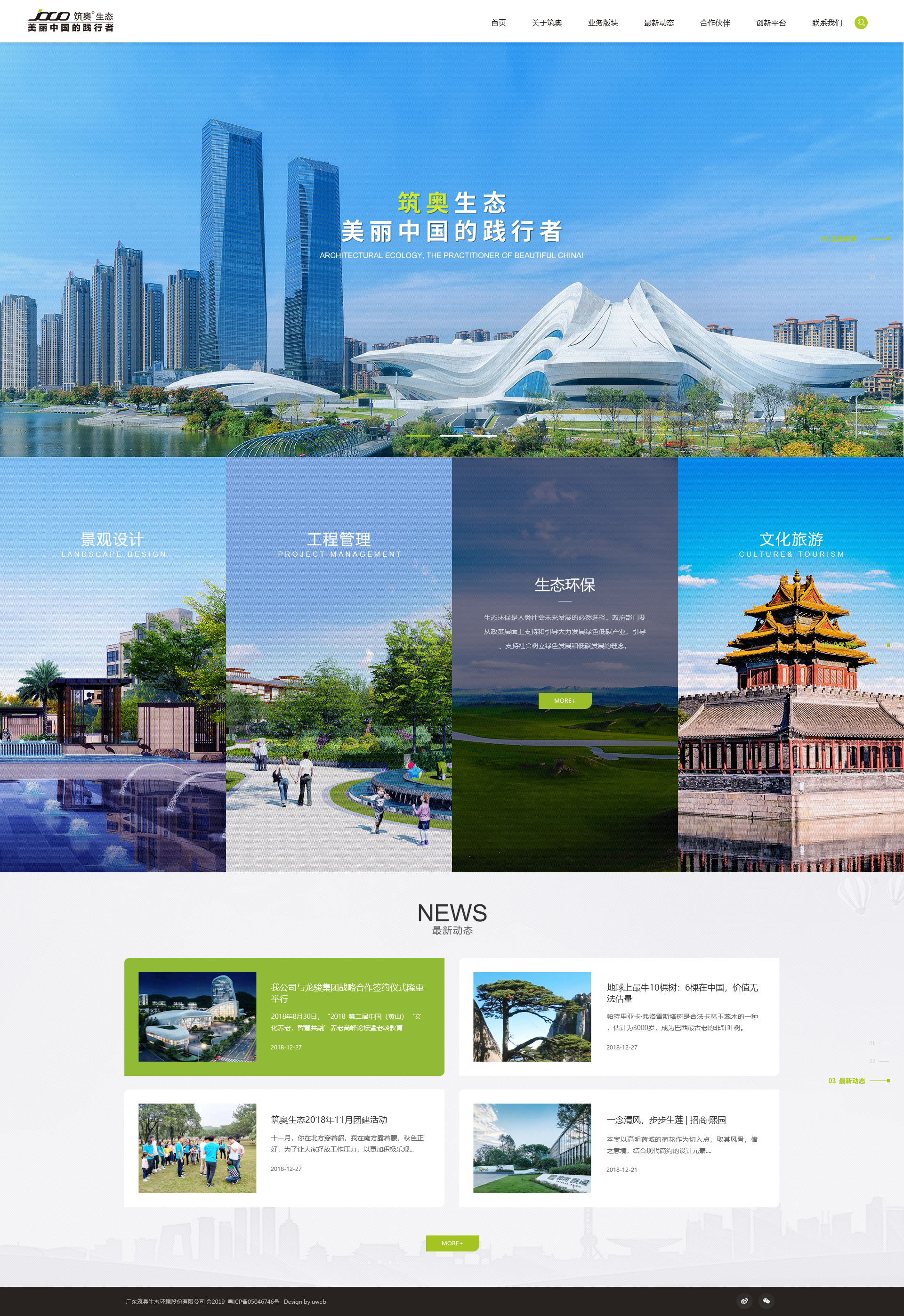 广东筑奥生态环境股份有限公司此次改版网站建设优网科技通过前期的调研了解项目制作需求,网页设计整体风格大气,网站的色调用色方面跟以往网站有比较大差别,为了网站的风格比较简约,不使用原来网站大面积的暗沉颜色。通过分析网站用户群体,以及行业特色等,网站首页采用单屏显示的特点,使得网站改版之后整体更加适合公司的品牌形象特点。整体网站建设调性以专业、明亮大气为主,图片和色彩的选用上面都遵循这一规则,页面配色以白色为主,绿色做为点缀,所选的素材皆以企业的业务类型和行业特性进行呼应,体现了筑奥生态的行业特性及“美丽中国的践行者”的企业理念。