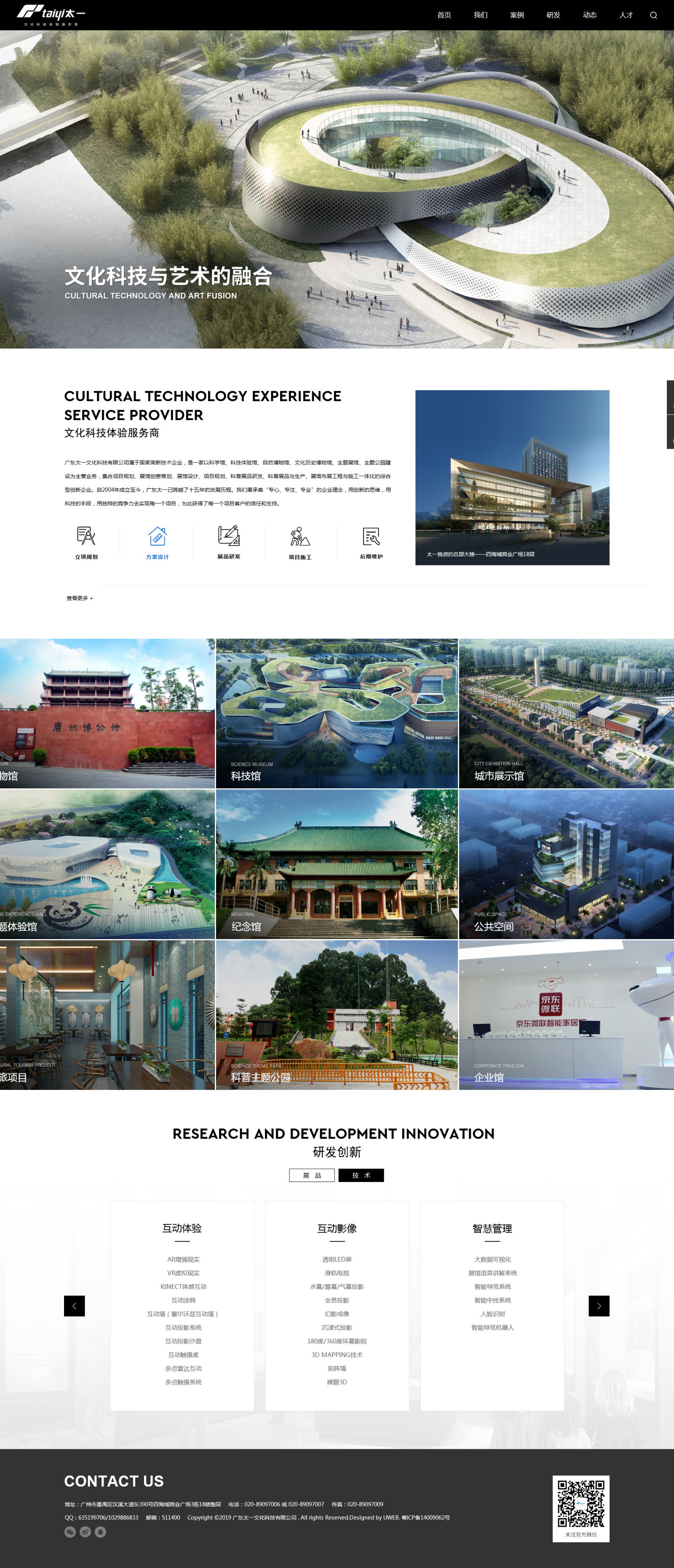 广东太一文化科技有限公司,创建于2004年,作为国家高新技术企业,一直致力于文化科技体验领域,业务涵盖科技馆、博物馆、主题体验馆、城市展示馆、企业馆、公共空间、主题公园、文旅项目和新农村建设等,是集合项目规划、创意策划、展馆设计、展品研发、展品生产、展馆布展工程施工一体化的多元综合型创新企业。我们秉承专心、专注、专业的服务理念,用创新的思维、科技的手段、高端的品质要求铸就每一个项目的独特魅力,助力文化与创新融入社会进程,为中国的文化科技发展贡献一份力量。