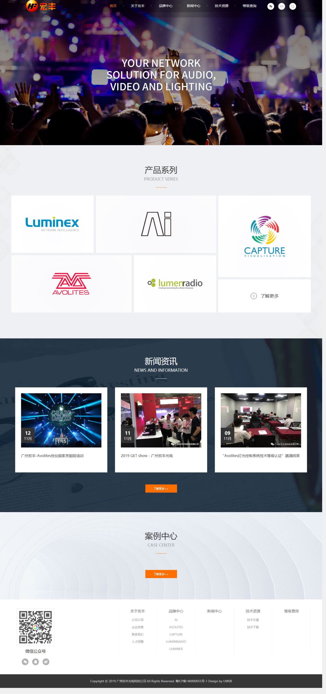 广州宏丰光电科技有限公司是一家专业舞台灯光控制系统、视频控制系统、视频显示系统、音频系统、技术服务为一体系统的集成商,是英国Avolites(爱富丽)旗下灯光控制系统、AI视频服务器等全线产品官方授权中、港、澳地区的总代理商。凭着优异的产品性能、成熟的技术服务和深厚的客户资源,公司在灯光控制、视频领域迅速崛起。公司聚焦文化创意产业,依托专业音响、灯光、视频产品与集成控制技术,形成文化与科技相融合的理念。公司发展过程中,不断与英国合作商和国内同行业翘楚交流合作,技术和售后得到不断提升,以的产品质量和精湛的技术服务受到了用户的一致好评。