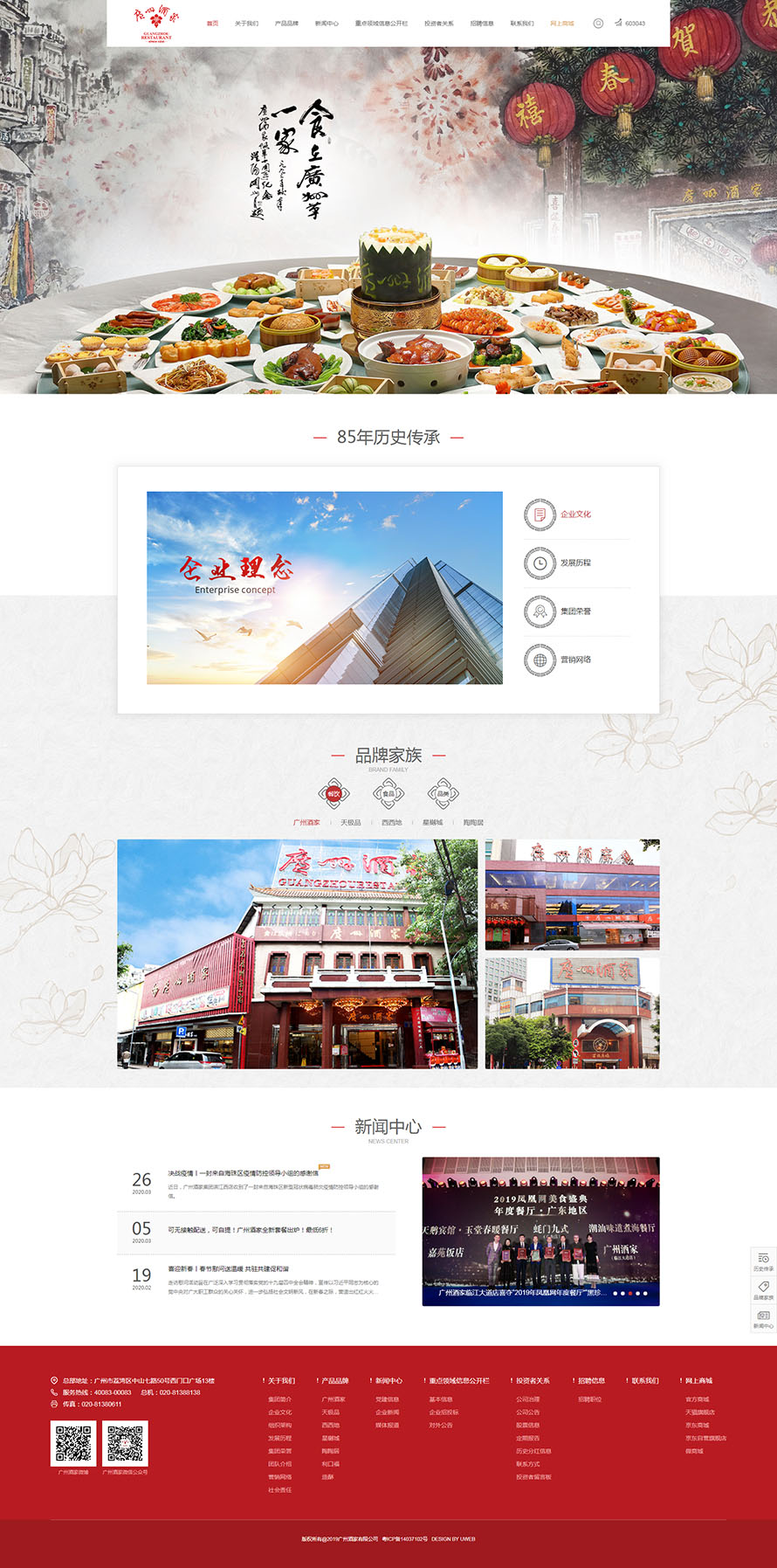 广州酒家集团官方网站经过广州酒家与优网科技多次沟通讨论,进行优化,目前网站建设完成,上线开始正式运行。整体网站页面设计上,简洁、大气,符合广州酒家调性和风格。红色为网站的主色调,搭配广州酒家特有的纹理和花,让网站又有一丝中国特色。首页以大幅广州酒家特色美食BANNER呈现,让浏览者一看,就能知悉是广州酒家。BANNER下方分别展现悠久的历史传承、品牌家族和新闻三大部分。